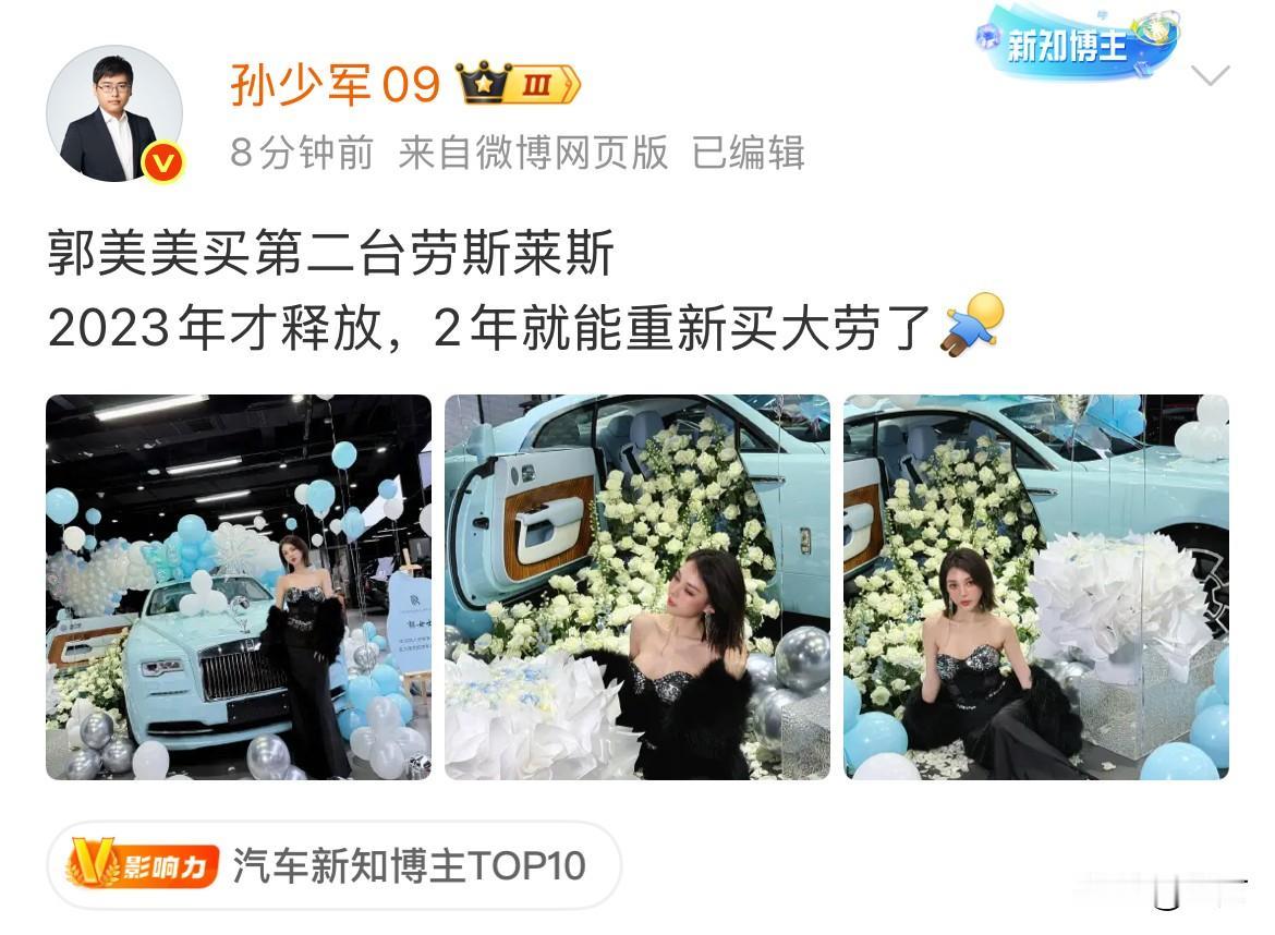 孙少军: 郭美美买第二台劳斯莱斯,2023年才释放,2年就能重新买大劳了! 不知道这位郭女士现在在从事什么职业,但是既然他前年才从里面出来,这才两年时间就能买到劳斯莱斯,说明她挣钱的能力一直都在线! 可能现在很多人都忘了她到底是做啥的了,也忘了她是因为什么进去的,但不管怎么样她不在两年前出来了,现在看这个样子,创业还挺成功的,从这个方面来说,这个女人还是比较有经商头脑的。 而且她这么多年了,好像也没有变老的样子,把妆容一化 走在大街上看起来也才20出头,她是怎么挣的这么多钱的[捂脸]