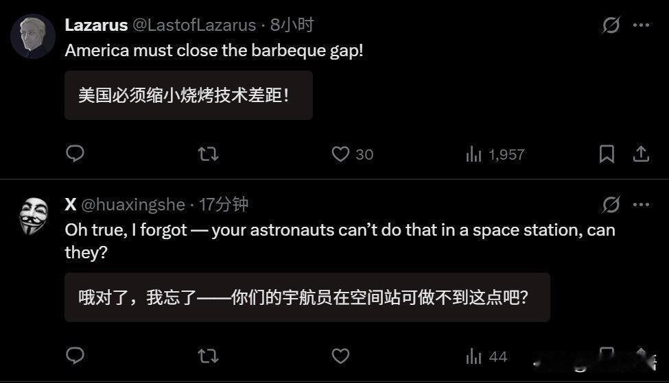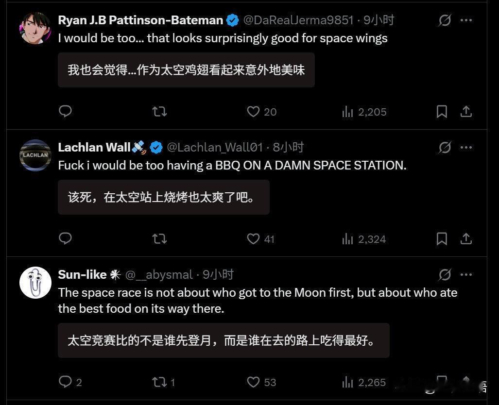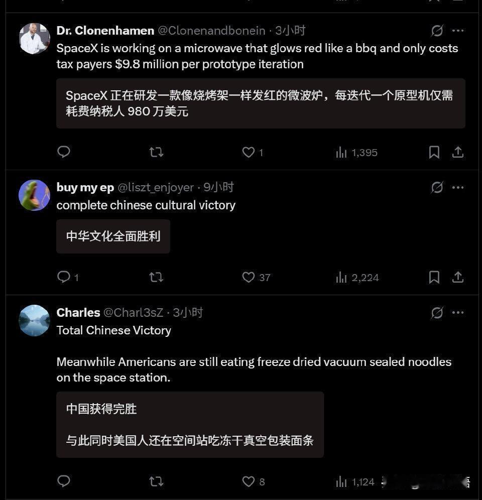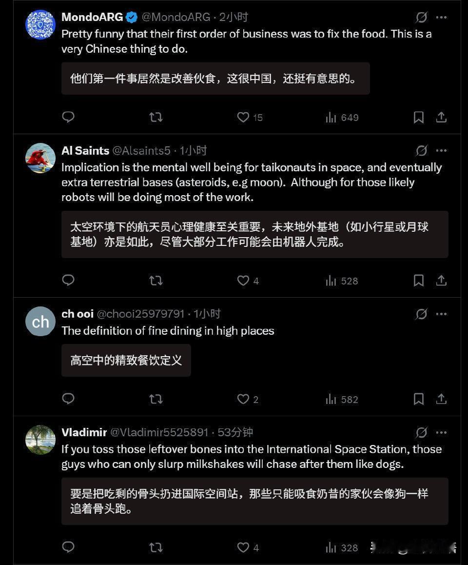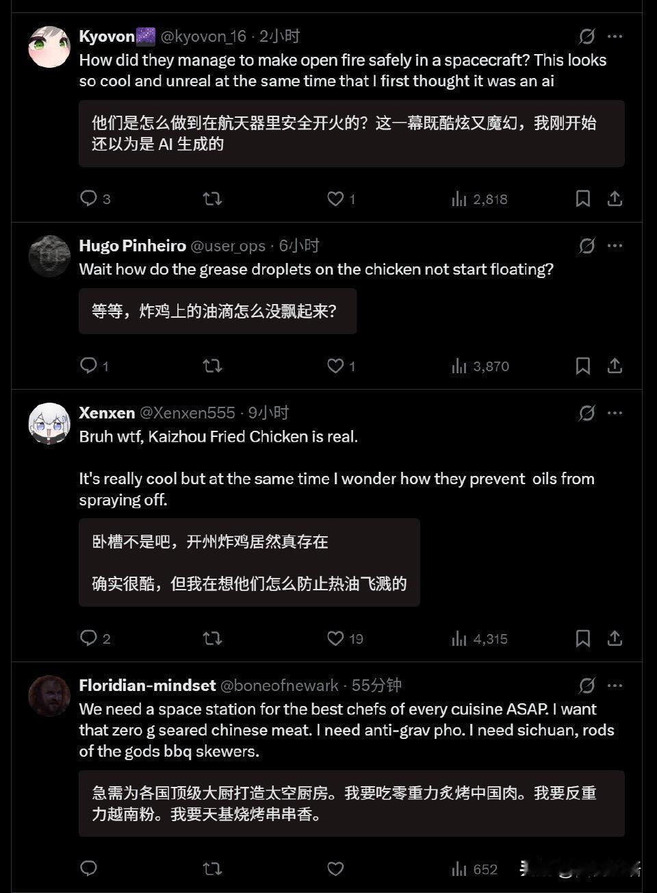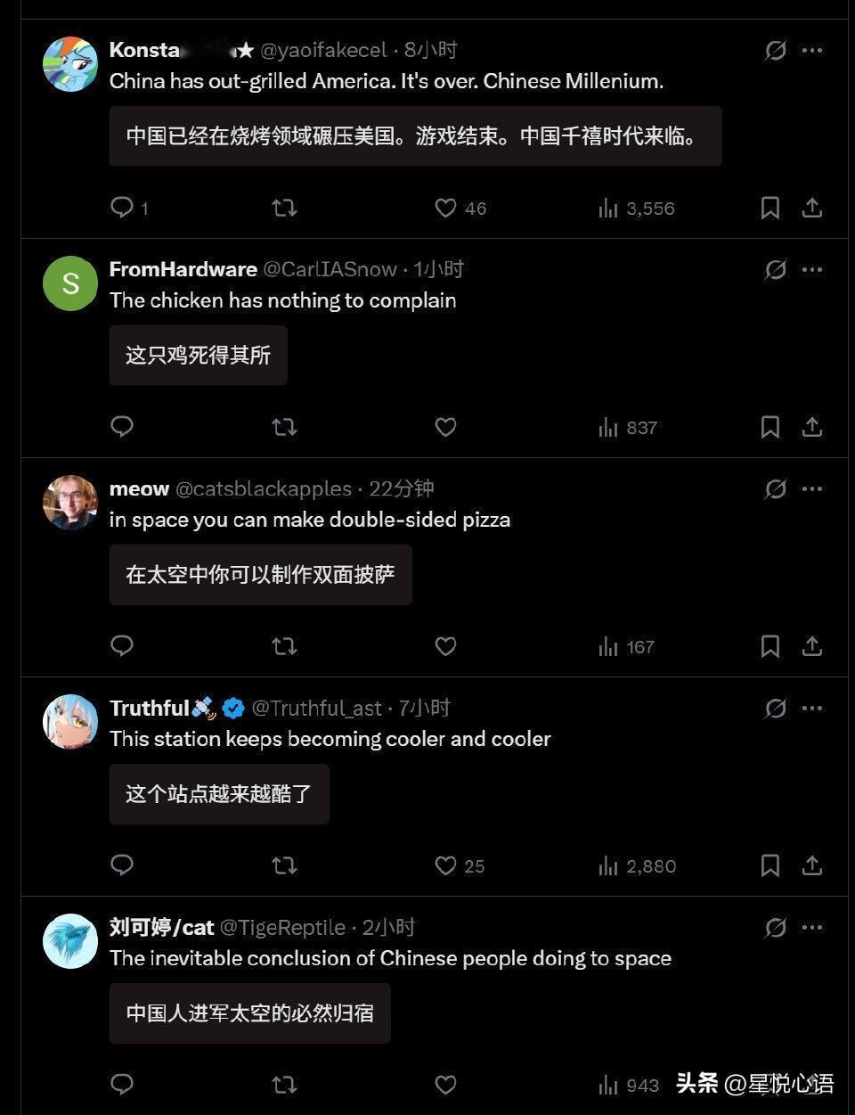 外国网友疯议中国空间站“烧烤”! 中国空间站又又又上热搜了! 这次居然是因为“烧烤”? 外国网友刷到相关画面, 直接炸开锅! 有人惊呼:“中国航天员在太空搞烧烤派对?也太会了吧!” 还有人调侃:“求配方!太空版烧烤是不是更香?” 其实这是航天员的在轨实验, 却被老外们玩出了新梗! 评论区全是羡慕嫉妒恨, 纷纷表示“中国航天太会整活” “这波操作直接拉满科技感和趣味性”。 从空间站到日常小浪漫, 中国航天总能给世界带来惊喜! 为咱们的航天人点赞!