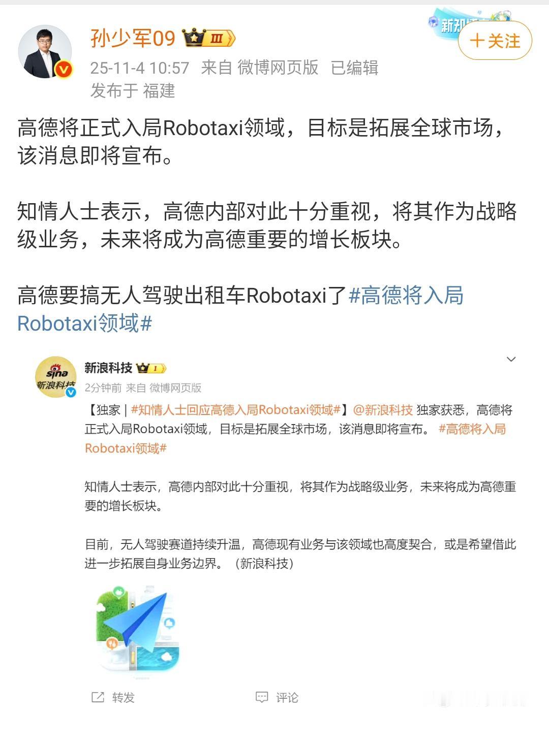 孙少军:高德将正式入局Robotaxi(自动驾驶出租车)领域,目标是拓展全球市场,该消息即将宣布! 高德这个动作幅度很大呀,目前最有效的方法是直接向小马智行购买他们生产好的车辆,然后直接在相关城市进行测试,然后争取推广到更多的地区。 各位是怎么看的?欢迎评论区留言。
