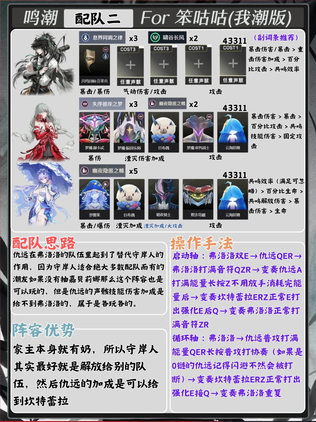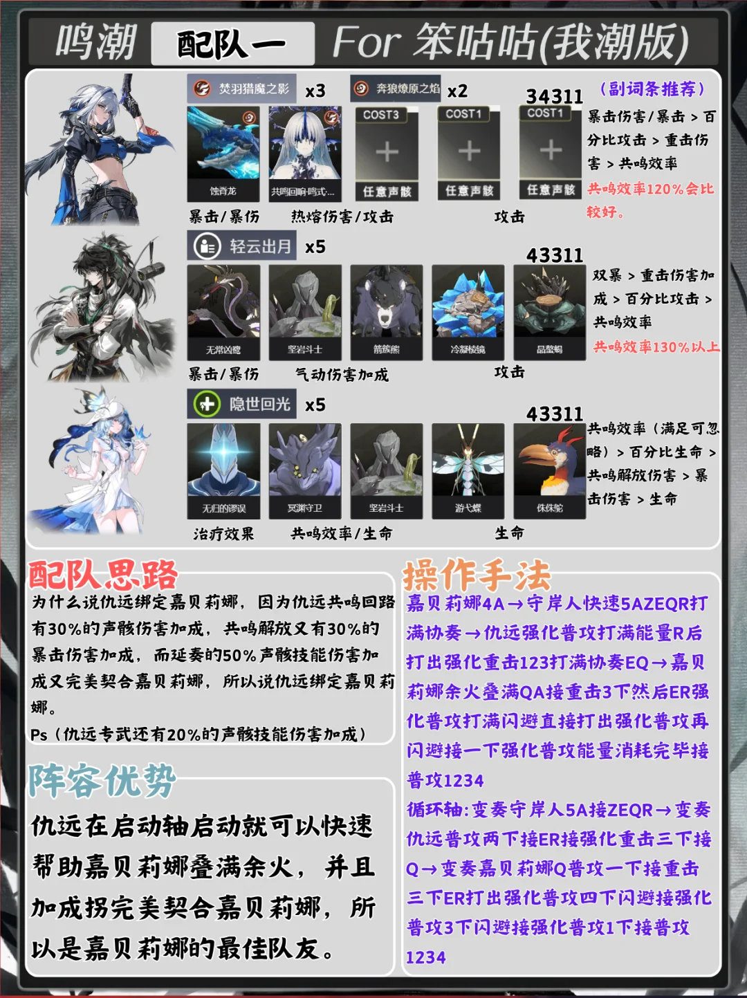 鸣潮 鸣潮创作激励 踏上鸣日的征程 鸣潮攻略 鸣潮配队 鸣潮仇远 本期内容带来的是2.7版本“仇远”的配队攻略~ 内含声骸/配队等内容~ PS: 🌟 Cost3的提高热熔伤害和声骸技能伤害效果非常适配嘉贝莉娜,因为嘉贝莉娜的声骸技能伤害占比差不多有6成。 观看的小伙伴觉得不错的话一点要给个大大的赞噢! (内容制作数据相关参考鸣潮wiki,有错误引导,欢迎大家指教批评,笨某一定虚心接受!!) ------グッ!(๑•̀ㅂ•́)و✧------- 觉得有用的话一定要关关笨咕咕哦!好了,以上就是本期的全部内容。 ⭐制作不易,严禁任何商业性转载及搬运,转载需标注出处~ ⭐制作难免会有错漏,希望大家多多指出,我会及时修正喵~ ⭐祝大家都能十连双金!