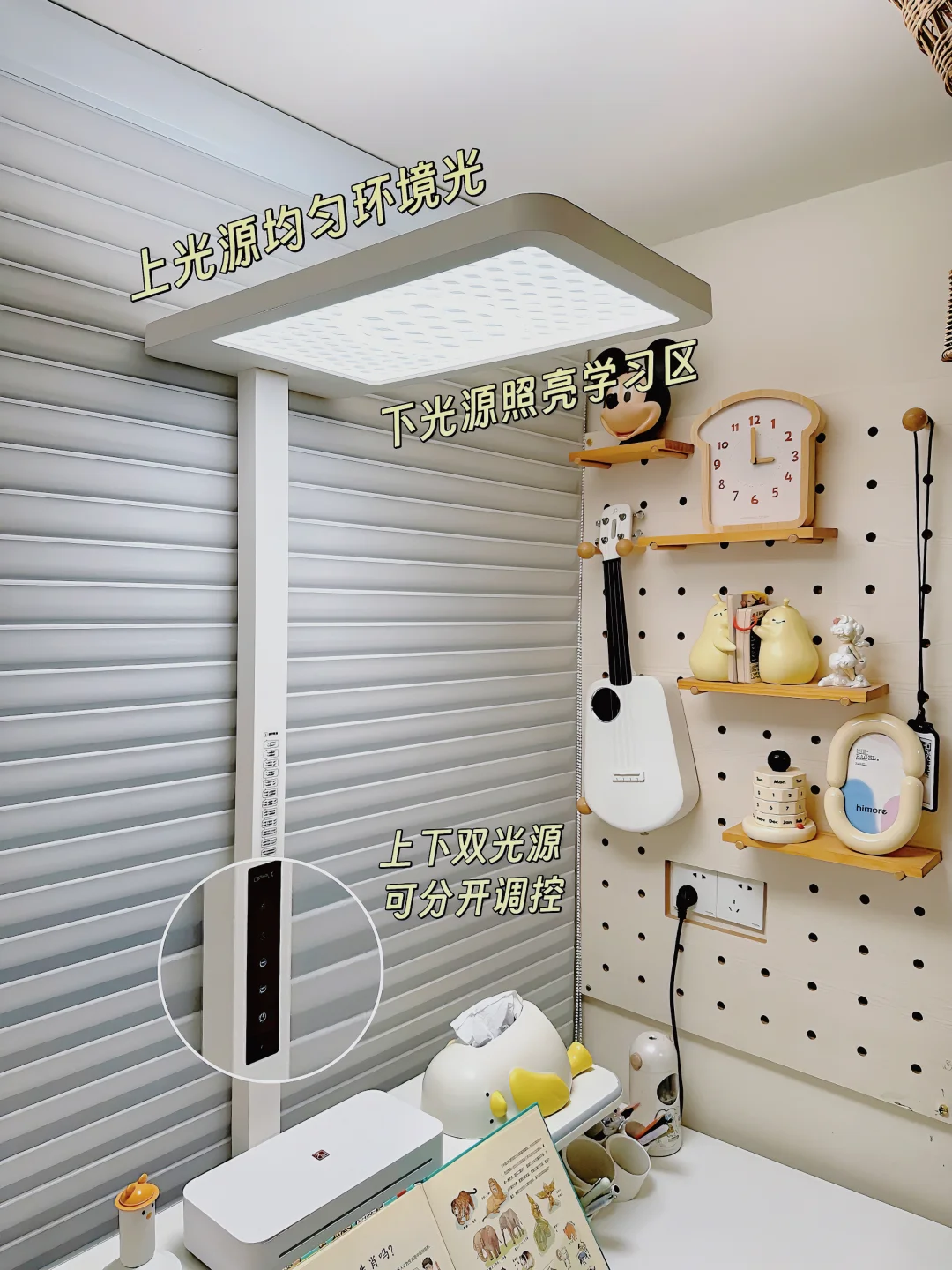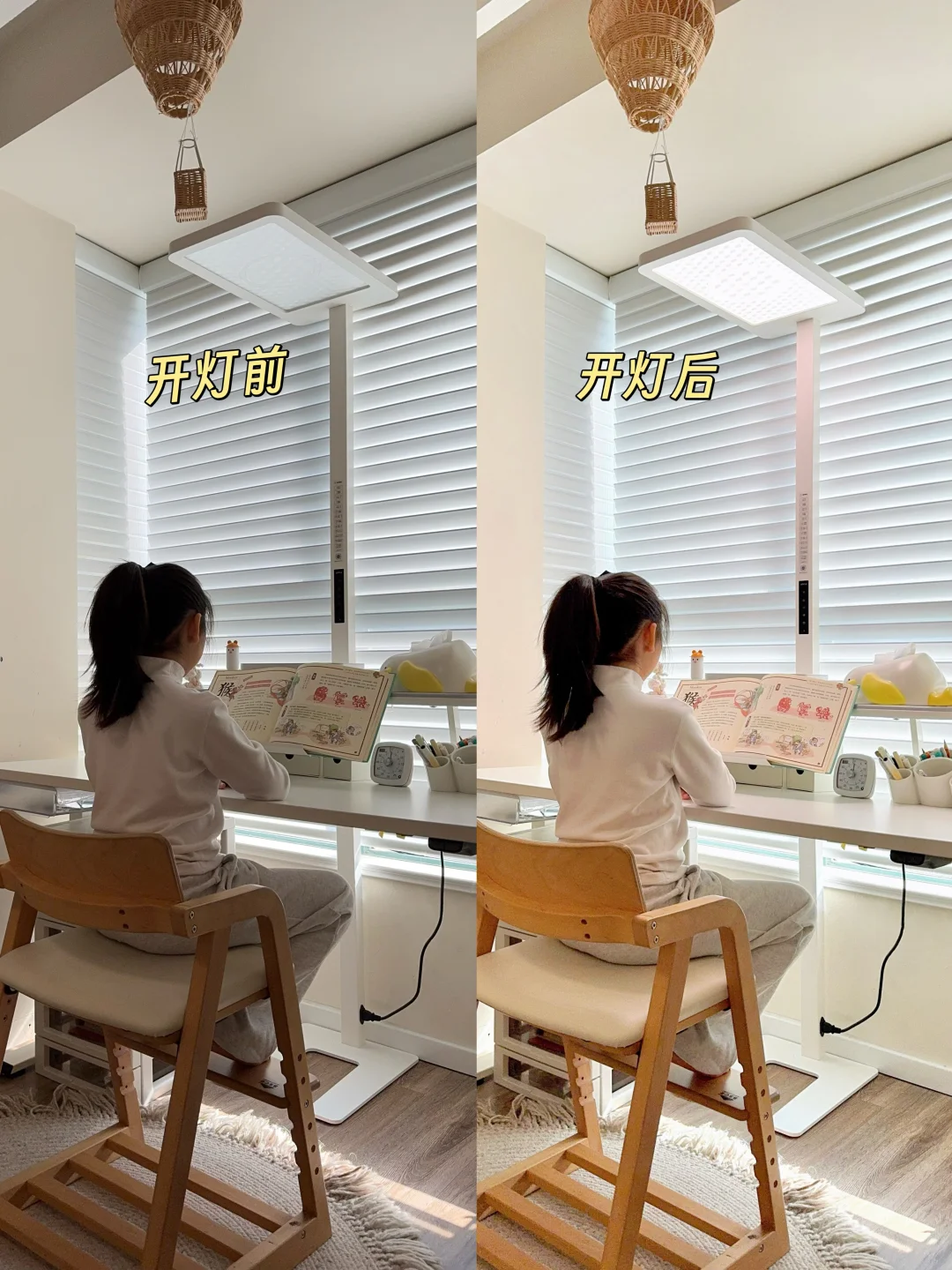 光照方面更是惊喜,9707lm的光通量,光效提升62%,我家11平的儿童房学习区(书桌+阅读角落)全被照亮了💡它上下360°立体发光,女儿在书桌写作业✍️我在旁边陪读,两个位置的光线都均匀得很,写作业时影子淡到几乎看不见,影子淡化效果提升了163%,女儿学习时更专注了,效率都高了不少