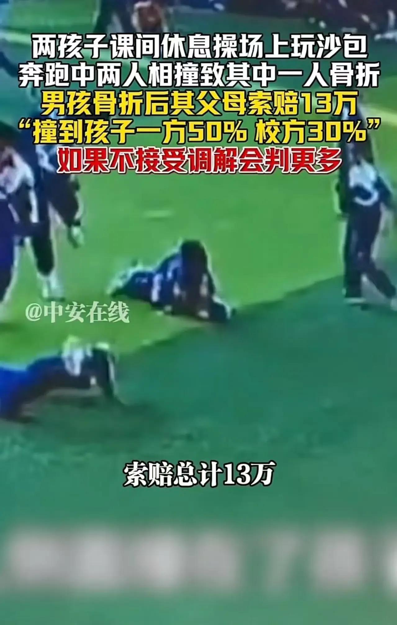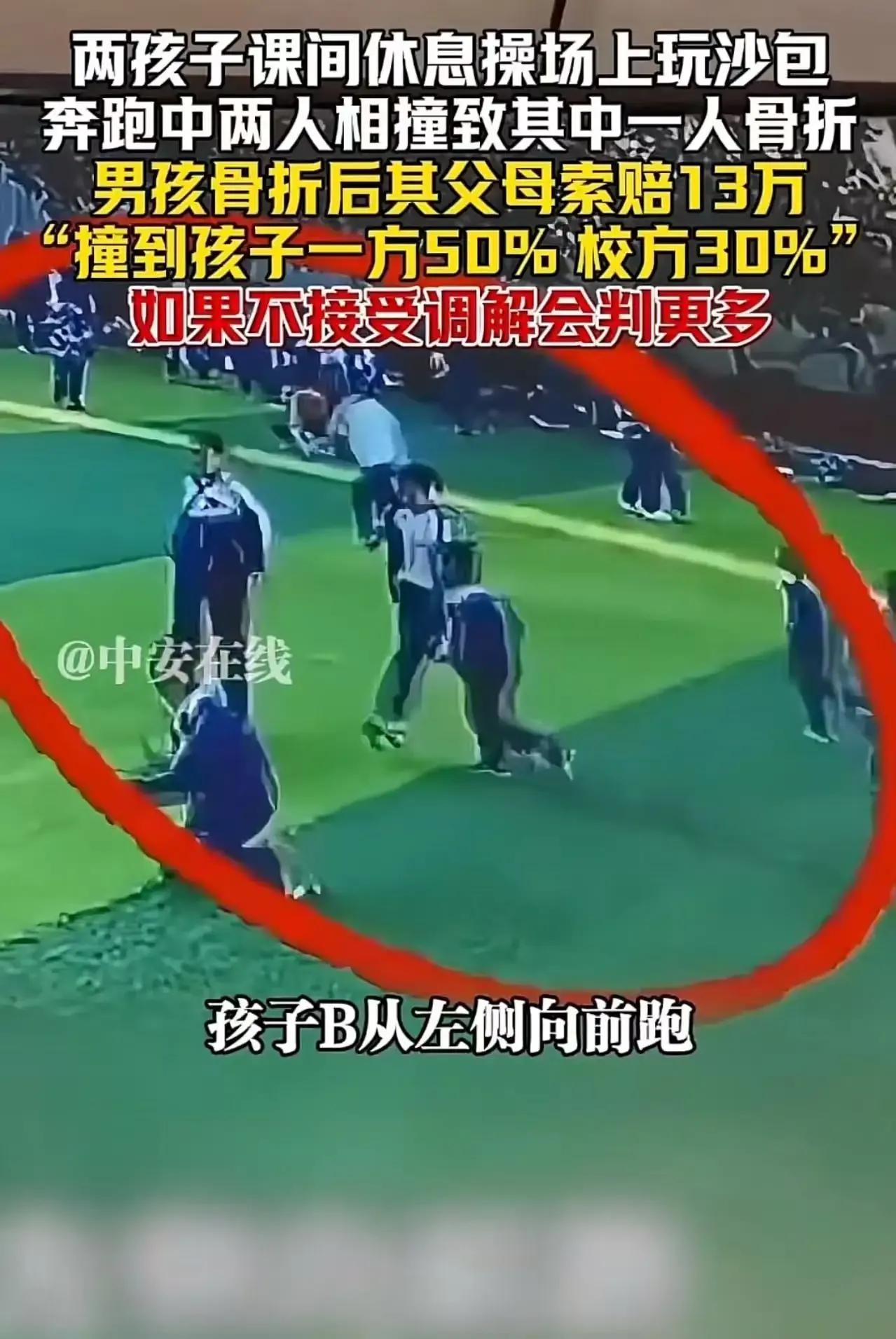 “他撞的我家孩子,凭什么让我赔钱?”吉林一学校发生孩子相撞事件,其中一人骨折后,家长竟被要求赔钱,这究竟是怎么回事? 事情发生在吉林某学校的课间休息时间,两个孩子在操场上尽情玩耍,奔跑中不慎相撞,导致其中一名男孩骨折。原本是孩子间的小意外,却因赔偿问题引发了双方家长的激烈争执。骨折男孩的父母认为,是另一方孩子撞倒了自家孩子,因此索赔13万。而另一方家长则觉得,这是孩子间的正常打闹,不应该承担如此巨额的赔偿。法官在调解过程中,提出了一个折中的方案,让另一方父母赔偿50%,校方赔偿30%。这一方案引发了不小的争议,有人认为这过于偏袒一方,也有人觉得这是公平合理的解决方式。如果不接受调解,法院可能会判出更高的赔偿金额,这让双方家长都陷入了纠结。 孩子间的打闹,却演变成了大人的赔偿纠纷,这背后反映出的不仅是法律问题,更是对教育责任的思考。对于此事,你有什么看法呢?欢迎在评论区留言讨论!被车撞了赔偿 追尾赔偿 学校是否担责