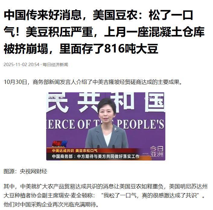 居然被我猜中啦!中国刚刚答应出手采购1200万吨美国大豆,没过两天,美国贸易代表就宣布继续对中国进行301调查,显示出美国强硬的态度。 美国这做法看着翻脸比翻书还快,其实全是早就算计好的套路,根本不是临时起意的冲动,说到底就是既要拿好处又想占便宜,强硬态度从来都是装在骨子里的。 中国愿意接下这1200万吨美国大豆的单子,真不是闲得慌给对方送福利,实在是美国豆农已经快被逼到绝路了。 毕竟中国一直是美国大豆最关键的买家,2024年光从美国就买了2213万吨大豆,占了美国大豆出口的半壁江山,毕竟美国大豆第二大市场墨西哥一年也买不到600万吨,跟中国根本不是一个量级。 但2025年情况急转直下,从5月开始中国就没再采购美国大豆,到后来甚至直接归零,这一下就让美国大豆库存飙到了10.08亿蒲,比市场预期还高,比去年同期足足涨了3.9%。库存堆得有多夸张?10月中旬美国伊利诺伊州一个小镇的混凝土仓库都被压塌了,里面整整816吨大豆全埋了,这哪是仓库,简直是大豆的“坟墓”。 美国大豆协会都急得给白宫写公开信,说农民们被关税和滞销折腾得“几乎没有盈利空间”,眼看就要批量破产,这时候中国伸出手,本质上是给美国农业续了口气。 关键是中国早不是没了美国大豆就不行的状态,这些年早就把供应链铺到了南美,还扩大了国内种植,就算不买美国大豆也能稳稳过日子,这次采购不过是釜山会谈里的约定——中国买大豆,美国取消10%的芬太尼税,甚至中国还额外承诺未来三年每年采购2500万吨,这份诚意够实在了吧? 但美国的逻辑从来都是“给颗糖就忘了自己姓啥”,刚等财政部长贝森特拿着订单在电视上吹嘘“重大胜利”,没过两天贸易代表就扛出了301调查的老牌子,这操作熟得不能再熟了,根本不是临时起意。 要知道301条款就是美国的“单边便利工具”,源自1974年的贸易法,说白了就是美国自己定规矩,想给谁扣“不公平”的帽子就扣,还不用受WTO这些国际规则的约束,比走多边程序快多了,简直是为霸权量身定做的。 这套路美国玩了几十年,早在1991年、1994年、1996年就三次用“特别301条款”针对中国知识产权,2010年又拿清洁能源政策开刀,每次都是先找茬再施压,最后逼着对方让步。 2025年更是把这套路玩得炉火纯青,4月刚针对中国造船业搞301调查,宣布要加收港口费,9月又出台新规,连跟实体清单企业沾点边的中国公司都要拉进黑名单,10月还顺手把15家中国企业加了进去,现在拿了大豆订单又续上调查,不过是故技重施。 这里面的算计太明显了,美国算准了中国讲诚信,只要答应采购就不会反悔,所以敢放心大胆地刚接订单就翻脸。毕竟大豆是美国中西部农民的命脉,2024年美国大豆出口总价值245亿美元,中国订单就占了125亿美元,要是农民真破产了,选票就得飞了,所以必须逼着中国买大豆救场。 但另一方面,美国又把中国当成战略对手,总想用贸易手段压中国让步,301调查就是最好的施压工具,既能给国内产业界一个交代,又能转移自身经济矛盾,简直是“一石二鸟”的如意算盘。 不过这操作就连美国自己人都看不下去,民主党领袖舒默都痛批这是“向中国低头”,说这1200万吨还不如贸易战前的量,根本算不上胜利。 其实美国心里门儿清,中国手里的筹码可不止大豆采购。稀土就是另一个关键,这玩意儿是芯片、电动车、先进武器的核心原料,美国再牛也绕不开中国的供应链,中方暂停管制是释放善意,真要是恢复管制,美国工业就得抓瞎。等于中国是拿着“软筹码”给美国台阶下,可美国偏要把台阶当成跳板,刚站稳就开始跳脚。 这种“给好处不记恩,给台阶还蹬鼻子上脸”的操作,早就不是第一次了,之前中美达成“百日计划”,刚有进展美国就发动301调查,跟这次的剧本简直一模一样。 说白了,美国从来没把双边贸易当成平等的合作,只当成单边薅羊毛的工具,既要靠中国救自家农民,又要靠打压中国刷存在感,这种矛盾的操作看似分裂,实则是刻在霸权骨子里的贪婪——好处要全占,便宜要尽占,至于对等尊重,从来不在他们的字典里。 中国愿意守约定买大豆,是讲诚信有格局,但这绝不是让美国得寸进尺的理由,真要是把善意当成软弱,最后吃亏的恐怕还是那些刚松口气的美国豆农,毕竟中国能决定什么时候买,自然也能决定什么时候停。