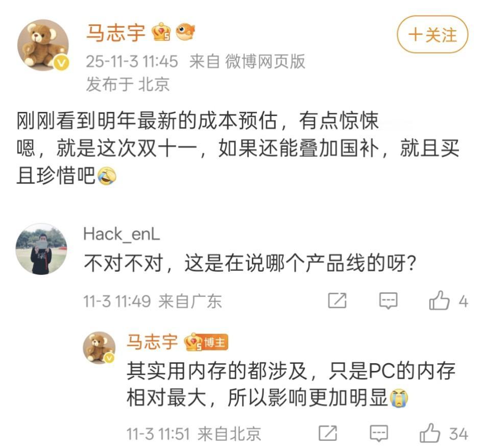 小米行销总监马志宇称明年内存成本预估“有点惊悚”,提醒双十一有补贴时“且买且珍惜”。所有用内存产品都受影响,PC内存尤甚,此前供应商预告Q4闪存价最高或涨30%。