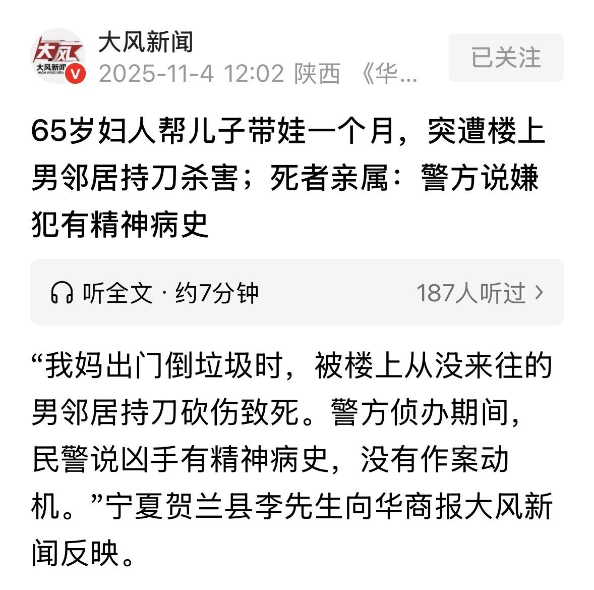 银川,女子65岁的婆婆下楼倒垃圾,却迟迟未归,过了一会,她突然听见走廊传来惨叫,女子透过猫眼一看,发现一中年男子正在持刀行凶,她隐约听见被害那人在喊她名字,很可能就是婆婆,女子吓傻了,连忙让儿子藏进衣柜,她则反锁房门,给丈夫打去电话并报警,等警方和丈夫赶到,婆婆早已倒在血泊中没了气,而行凶者竟是楼上有精神疾史的邻居,这让男子一家的维权路陷入困境。 36岁的李先生在县城里开了家餐饮店。 2025年8月,他儿子即将上小学,李先生的弟弟得知消息后,就把在县城里闲置多年的二手房借给李先生一家暂住了。 这样一来,既能省去租房钱,家里65岁的母亲也能过来搭把手,帮忙照看孩子。 然而,把母亲叫来家里帮忙,成了一家人余生最后悔的一件事。 10月12号下午3点,李先生像往常一样去店里张罗生意。大概40分钟后,妻子黄女士的电话突然打来。 电话那头,妻子的声音带着明显的颤抖,说楼道里有惨叫声,她透过猫眼看到有个穿灰衣服的男人正在拿刀行凶!那受害人好像在喊她的名字…… 事发时,黄女士正在厨房收拾,突然听到门外传来很大的动静,透过门缝看到有个穿灰色上衣的中年男人拿着刀在砍人。 黄女士哪遇见过这种场景,她吓得腿都软了,她赶紧把正在写作业的孩子塞进衣柜,反锁了门。 她哭着告诉丈夫李先生,婆婆苏某刚刚好下楼倒垃圾,一直没回来,再结合楼道里的受害人一直在喊她名字,她怀疑就是婆婆遇害了。 可她一个女人家,势力单薄,不敢开门,更不敢出去查看情况,万一引狼入室,那她和孩子也性命难保。 李先生听后心头一惊,让妻子在家好好待着,他则立刻往家赶。 下午4点08分到小区时,警车和救护车已经围住了单元楼。他挤开人群上楼,看到了这辈子无法忘记的一幕。 只见母亲倒在家门口的血泊中,脸上、耳朵、双手全是刀伤,整个人已经没了血色。 这一幕,让李先生彻底崩溃了。 嫌疑人姓同,住在6楼,当天他穿着条红裤子,被几个民警按在地上铐走了。 可李先生不明白,他们家和这个姓同的无冤无仇,连个交集都没有,对方究竟为何这样对他母亲痛下死手? 警方后来告诉他,57岁的同某就住他们家正上方,2008年就查出有精神病史,但平时独来独往,邻居们都没察觉异常。 法医鉴定显示,李先生的母亲苏某是被片状尖锐器多次砍切头面部和双手,导致失血性休克死亡。 这个结果让李先生一家陷入了巨大的悲痛中。 事发后第5天,同某的家人通过警方送来6万元丧葬费,但作案动机至今成谜。 警方解释称,同某没有明确作案动机,就是正巧遇到了李先生的母亲。 记者走访社区时,工作人员表示事前并不掌握同某的精神病史情况。小区物业也强调,同某独居多年,平时没发现异常行为,直到案发后才配合社区对辖区内精神障碍患者进行排查。 如今,李先生最担心的是司法鉴定结果。 如果同某被认定在作案时处于精神病发病期,可能免于刑事责任,那他们该找谁讨回公道? 母亲勤勤恳恳一辈子,还没享上啥福,最后就因为帮他们带娃搭上了命,这口气怎么咽得下? 11月3号,记者联系当地公安局求证时,相关工作人员表示案件仍在侦办中,同某的精神鉴定将由专业司法机构出具最终结论。 而社区方面则称会安排专人回复记者提问,但目前仍未收到具体答复。 那么,从法律角度,怎么看待这件事? 《民法典》第1188条规定:无民事行为能力人、限制民事行为能力人造成他人损害的,由监护人承担侵权责任。有财产的无民事行为能力人、限制民事行为能力人造成他人损害的,从本人财产中支付赔偿费用;不足部分,由监护人赔偿。 如果嫌疑人同某经司法鉴定确认为精神病人,且在作案时处于发病状态,那么他的民事赔偿责任需通过本条规制。 如果同某的监护人未履行监护义务,如未定期探视、未监督服药,则需承担全部赔偿责任。 例如,如果同某名下有房产或存款,应优先从中划扣赔偿金,不足部分由监护人补足。 同某家人仅支付6万元丧葬费,远低于宁夏2025年人身损害赔偿标准,所以李先生可以主张扩大赔偿范围。 其次,社区和物业也难逃追责, 社区与物业声称"事前不知情",但案发后排查精神病史居民的行为已构成事实上的管理失职。 如果两方存在管理漏洞,可要求社区、物业在监护人赔偿不足时承担30%-50%的补充责任。 那么,李先生接下来该怎么维权呢? 首先,他应该申请法院调取同某的监护人信息及财产状况,锁定赔偿主体。 其次,他应该向社区、物业发送律师函,要求提供近三年的巡查记录与居民档案,固定管理失职证据。最后,同步提起刑事附带民事诉讼,将监护人、社区、物业列为共同被告。 对此,你怎么看? 关注@运良说法. 学法律知识不迷路