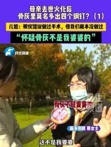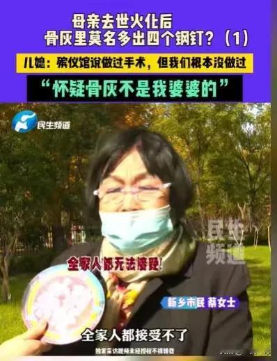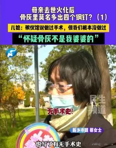 河南新乡,90岁老人因病去世,家属送她去火化,一切都按照流程走完了,殡仪馆通知家属去捡骨灰,结果眼前的一幕,让大家都惊讶了,只见骨灰上面有4个大钢钉,他们一致认为这骨灰不是老人的,殡仪馆工作人员说,老人做过手术就是有大钢钉的,但老人从未做过手术。 这个90岁的老人,就是蔡女士的婆婆,她因为生病,长期卧床,一直以来都是蔡女士照顾婆婆的。 蔡女士对婆婆非常好,经常给她翻身,擦身,婆婆身上有什么问题,她一清二楚,她从来没有听说过,婆婆做过手术。 老人没有做过手术,火化出来的骨灰竟然有4个大钢钉,并且还镶在骨头里,这件事就蹊跷了,这骨灰到底是不是蔡女士的婆婆的? 搞清楚这件事,就要搞清楚,蔡女士的婆婆到底有没有做手术? 根据钢钉镶着的骨头来看,这大钢钉是在腰椎上的,也就是老人如果做过腰椎手术,里面就有很有可能留下大钢钉。 蔡女士说她照顾了婆婆那么长时间,没有看见过婆婆身上有伤口,更没有听婆婆说过做手术,如果这是蔡女士的一面之词,那么这件事就有可能是家属记错了。 但是蔡女士和家属坚决表示老人没有做过手术,为了拿出证据,他们拿出了老人以往的病历,在上面,医生清清楚楚地记录着,老人没有手术史。 如此一来,家属们更加坚定,这骨灰不是老人的。 他们又回想起了当时的情况,更觉得事情蹊跷。 当时老人因病离世之后,他们就把老人送到殡仪馆火化,当时火化的时候,是有三已故的人,同时进行火化的。 整个流程都没有什么问题,只有在捡骨灰的环节出现了问题。 当时一家人看到骨灰上有4个大钢钉,惊讶之余就确定这骨灰不是老人的,但工作人员坚决表示,这不会又错,那就是老人的,双方各执一词。 要还原事情的真相,那只有看监控,在火化之前监控是很完整的,然而火化之后的监控却断断续续,有缺失。 这更让家属们认定这骨灰不是老人的。 他们质问殡仪馆为何有些监控缺失,工作人员又找借口,说监控线路老化,所以记录不上。 这么说来,他们更加坚定,这骨灰就不是老人的,可问题就卡在这里,殡仪馆坚决表示这骨灰就是老人的。 事情就这样陷入了僵局,家属无法确认骨灰就是老人的,就无法把老人的骨灰和她的老伴合葬。 事情发生之后,蔡女士和家人都很痛苦,老人离世了,他们却无法确认骨灰就是老人的,他们无法尽快地将老人入土为安。 他们只想拿到真正属于老人的骨灰,可是殡仪馆这边,又无法提供完整的监控记录,去确认这骨灰就是老人的。 回想这件事,老人没有受伤,没有手术,有钢钉的骨灰肯定不是老人的。 当时有三个已故的人同时火化,那么有可能,殡仪馆的工作人员有失误,流程走错了,导致蔡女士婆婆的骨灰已经被别人给领走了。 如此一来,这三个已故人骨灰都有可能领错,动过手术的,留有钢钉的,这一个可以确认下来,没有钢钉的另外两个已故人的骨灰,就很有可能搞错了。 若事实如此,这件事涉及的就不是蔡女士一家人的,这涉及的是三家人的事情。 正因为骨灰无法确认,蔡女士一家人才找来了调解员。 殡仪馆的人一开始表示,流程监控室的监控开得很清楚,不会有错的。 后来蔡女士表示监控是断断续续的,对于缺失部分,殡仪馆的工作人员又说监控线路老化了。 显然在这件事中,殡仪馆的工作人员做得不到位,如今要确认哪个骨灰是蔡女士的婆婆的,真的很难。 后来调解员提出建议,拿骨灰去做鉴定,以便确认,好让家属拿回真正属于老人的骨灰。 那么蔡女士家人遇到的这件事该怎么办呢? 首先,他们怀疑骨灰不是老人的,那么就得拿出证据。 《民事诉讼法》第67条规定:当事人对自己提出的主张,有责任提供证据。 因为老人没有做过手术,蔡女士一家人也调出相关的病例,证明老人没有做手术,身上没有钢钉,这就足以证明这骨灰不是老人的。 其次、如果这骨灰确实不是老人的,那么工作人员在这个过程中肯定是有过失的。 《民法典》第1165条规定:行为人因过错侵害他人民事权益造成损害的,应当承担侵权责任。 既然工作人员有过错,那么他们就应当承担过错责任。 如果鉴定结果证明骨灰不是老人的,那么殡仪馆就得承担相应的责任, 发生这样的事情,可能会给老人的家属造成精神损害,殡仪馆需要对老人家属进行精神赔偿。 《民法典》第1183条规定:侵害自然人人身权益造成严重精神损害的,被侵权人有权请求精神损害赔偿。 那么你认为这骨灰是老人的吗?