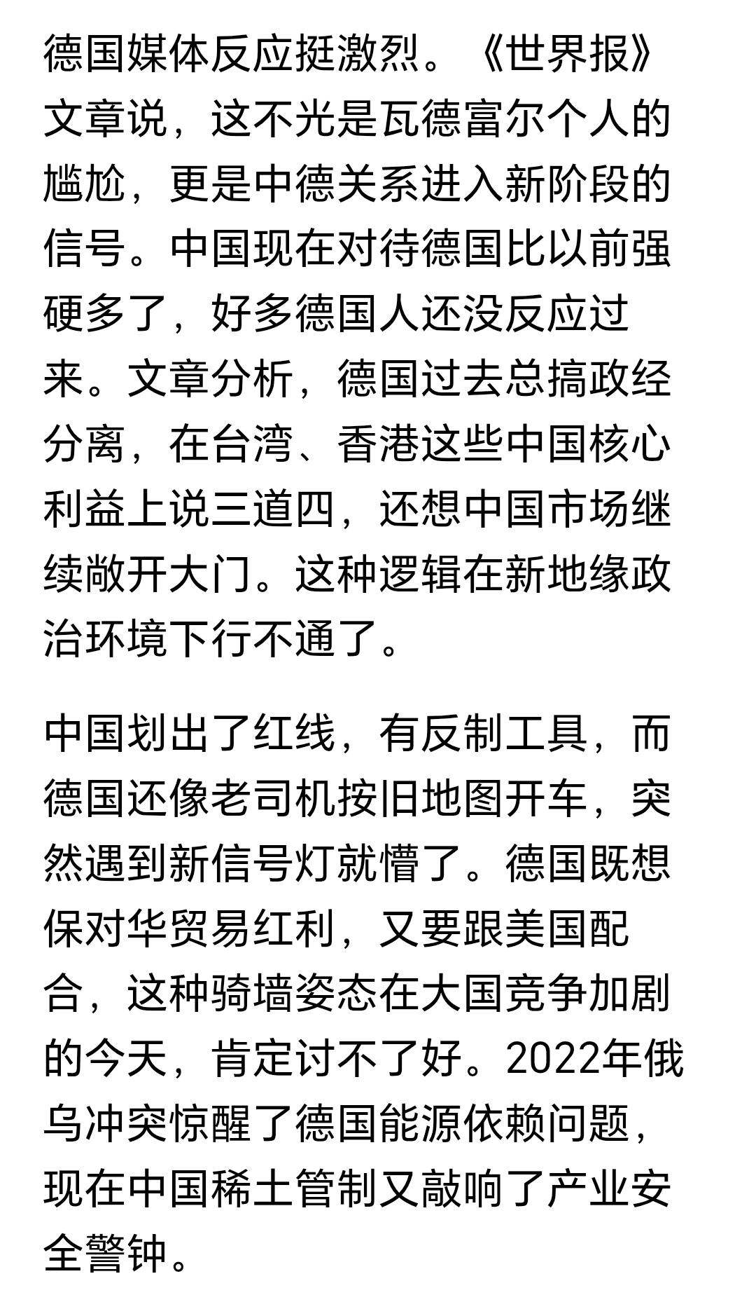 德国人是什么时候突然变得这么愚蠢了呢?东大为什么抽你们一耳光到现在还不明白吗? 想想为什么默克尔执政时中德关系那么融洽?你们现在又干了哪些和她不一样的事? 你们一次踩了两条红线,不扇你巴掌扇谁? 一,台湾问题,这是你们应该远离的问题。当年我们无条件支持你们统一,现在轮到我们了,你们却在这里大放厥词,在我们中国看来这叫忘恩负义。对你们这种人从情感上就会反感。从法理上来说,台湾问题是中国的内政,什么时候轮到你们来指手画脚?明白不? 二,日本和你们是给全世界带来灾难和痛苦的国家。日本至今都没有认真反省其战争罪行,你们又要和日本勾搭在一起,勾起中国人民的痛苦回忆,你首先展现你们对中国的敌意,不讨厌你讨厌谁?现在知道为什么默克尔到中国9过日本而不入了吧?安倍当时可是怨声载道。可见默克尔比你们现在这帮政客高明太多。 现在明白了不?生意场上的争执我们不会动手的,但是踩到这两根红线,挨耳光一点也不冤枉。 但是德国这帮白左肯定还是搞不懂。毕竟偏见是他们与生俱来的傲慢。 点右上角关注我,我们一起去看这个魔幻的世界