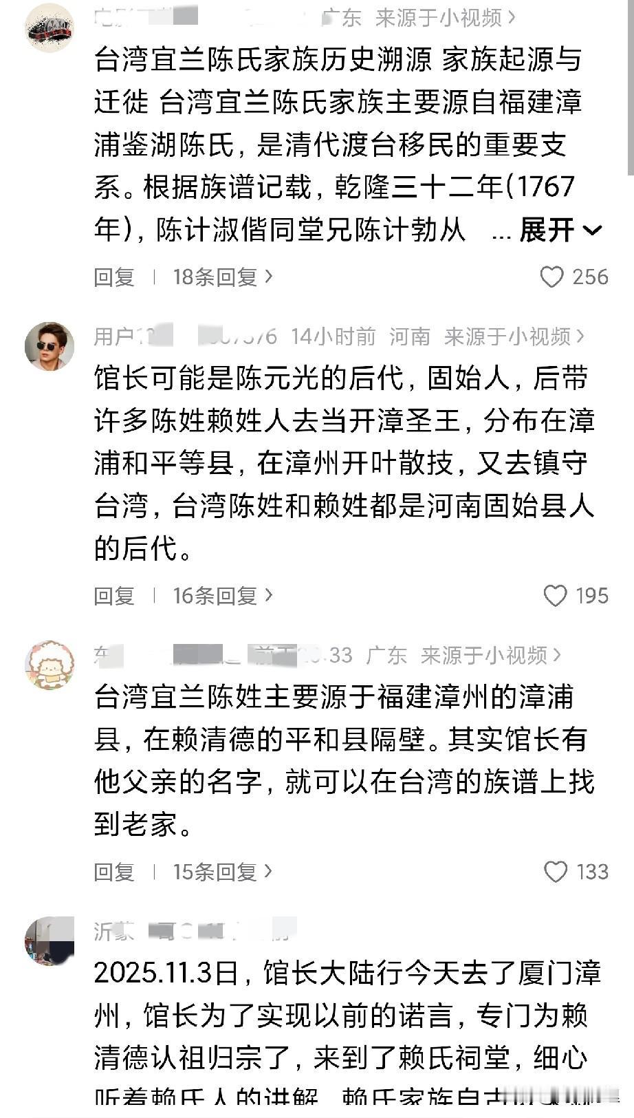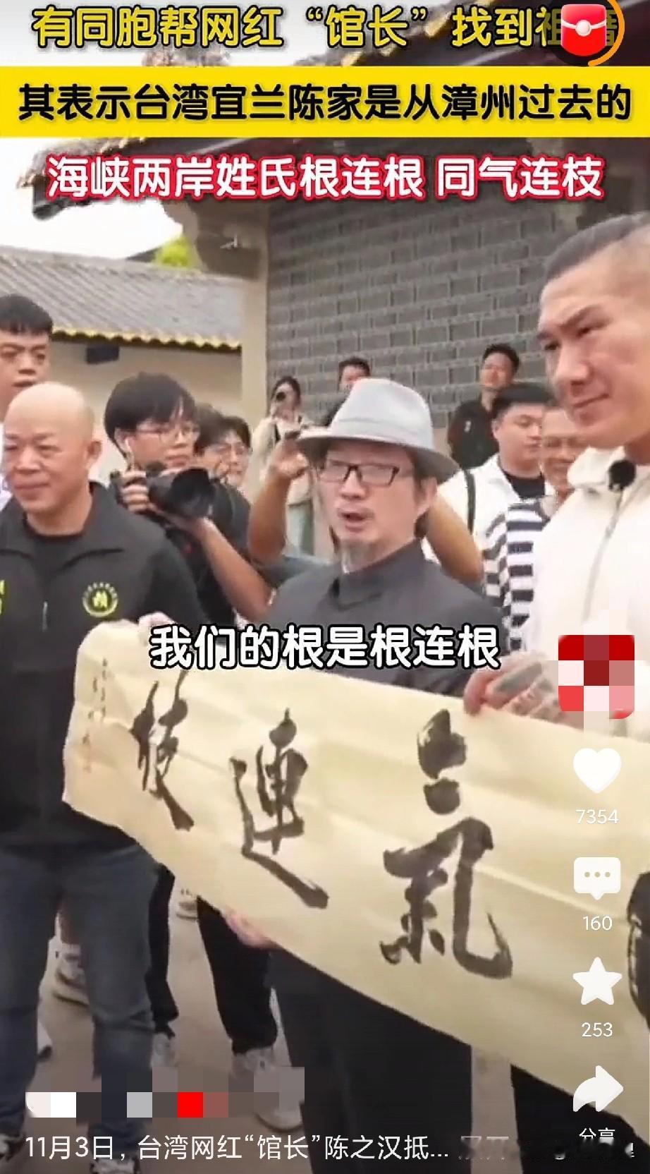 台湾馆长寻根记:替赖清德找祖宗,却发现自己也是漳州娃。 台湾网红“馆长”陈之汉这次大陆行,本是冲着赖清德去的——他放话要替赖清德“寻根”,揭他数典忘祖的底。 11月3日,他真站到了福建漳州平和县心田村的赖氏家庙前。族谱一摊,白纸黑字:赖清德祖上第十四世“挺公”迁台,根就在漳州。家庙里“不孝之人罪逆天”的祖训牌匾,看得人心里一震。 馆长当场喊话:“不要赖了,历史就在这儿!”他本想当个“打脸主播”,结果没想到,反转来了。 直播时,一位福建宗亲突然凑上前:“我已经帮你找到你的祖籍了!你是漳州陈氏‘开漳圣王’后裔这一支,族谱对得上!”馆长一愣,现场对照字辈、迁徙脉络,竟惊人吻合——他爷爷那辈正是从漳州渡海赴台,他也是地地道道的漳州后代! 馆长这次“帮人寻根变自己认亲,这波是双向奔赴!”“本来是来揭人的,结果把自己也搭进去了。” 可这不正是最真实的人间剧本?一个曾怒怼“台独”虚妄的人,如今站在祖先的土地上,才发现自己也在逃避某种真相。他本想撕下赖清德伪装的面具,却在祖庙的香火中,看清了自己的脸。 馆长,站在赖氏祖庙前,语气变了:“我不只是替赖清德来的,是我回家了。” 原来,有些根,不是你认不认的问题,而是它一直都在,静默如山,等你转身。馆长寻亲记