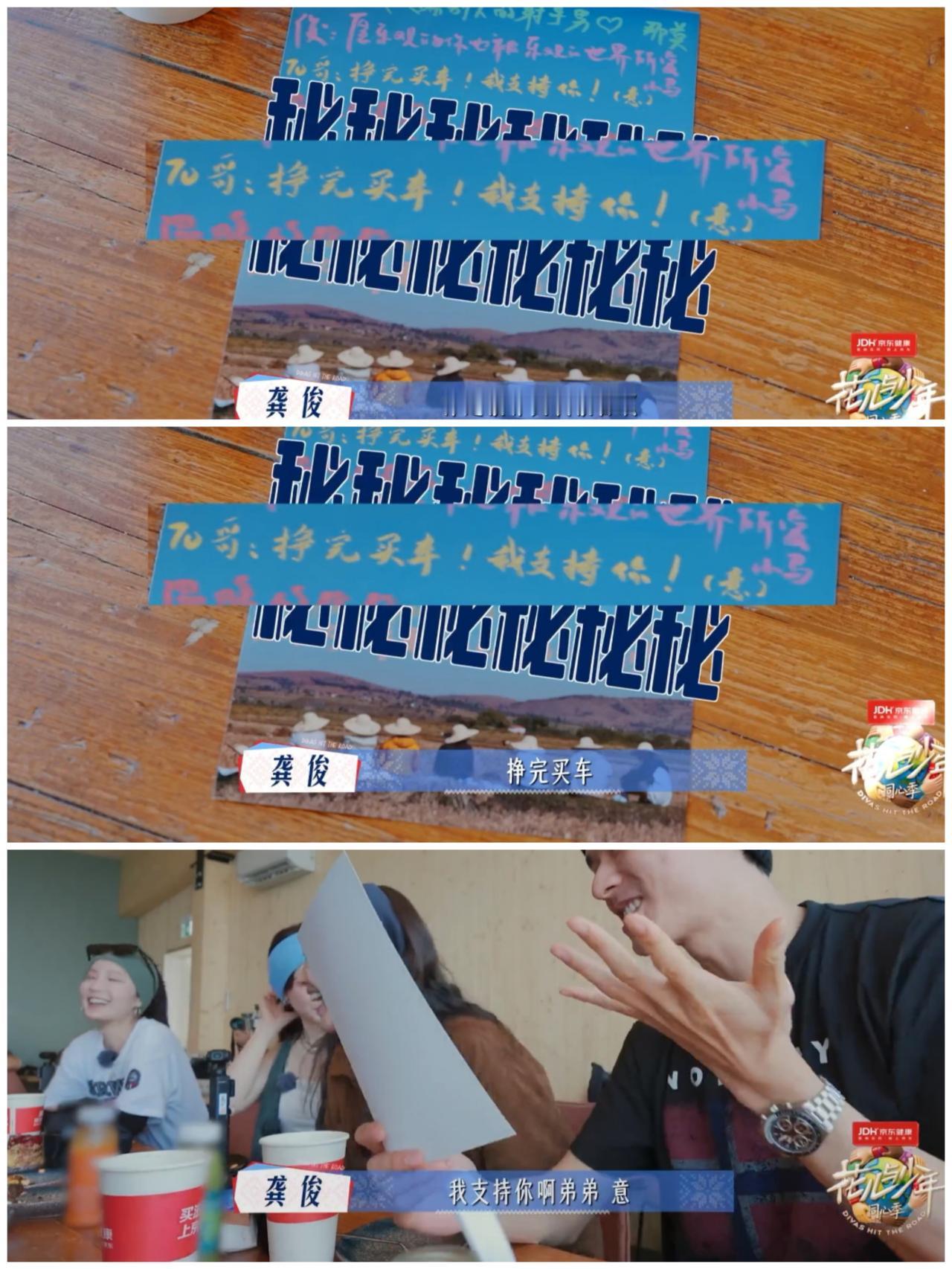 龚俊说了一半突然停顿, 马思纯,张雅琪都忍不住 凑过去看看 到底怎么回事。 龚俊准备深情读张晚意的离别赠语, 结果就读了一个开头, 就突然停下来了。 张晚意瞬间意识到 是不是对着镜头无法读出来呀, 不能播呀。 这样身边的马思纯,张雅琪的好奇心 被瞬间点燃, 马上凑过去看个明白。 哦, 原来张晚意写的是 “挣完买车!我支持你!”。 马思纯看完都忍不住大笑, 觉得张晚意太实在了, 什么事情都往外说。 龚俊曾说妈妈管着他的钱, 他前段时间工作特别累, 想给自己买一个礼物, 妈妈不让他买。 难道这个礼物就是“车”, 看来这次节目的酬劳 足够他买一辆心爱的车了。 不过当下节目把龚俊的小心思 都播出来了, 他妈妈看到了, 龚俊这个车还能买成功吗? 会不会又被妈妈阻止呀。 张晚意在赠语中的“我支持你”, 包不包括金钱上的支持呀。 龚俊看上的车看来不便宜, 如果他妈妈不批准“款项”, 张晚意是否准备全款支持呢? 如果是这样的话, 张晚意这个“赠语”太费钱了。