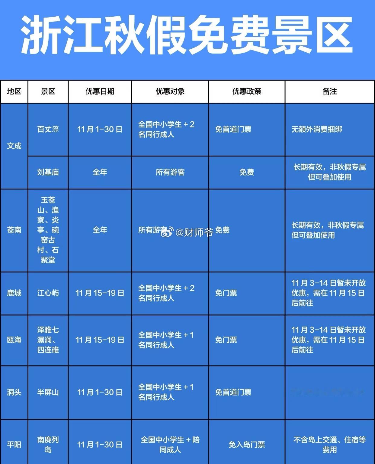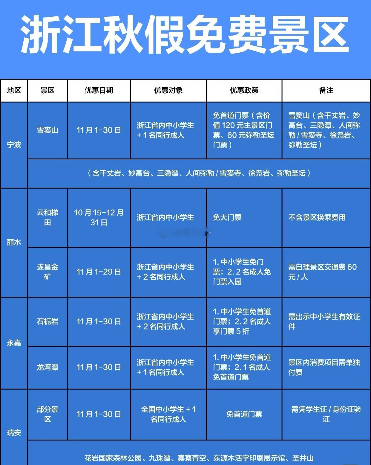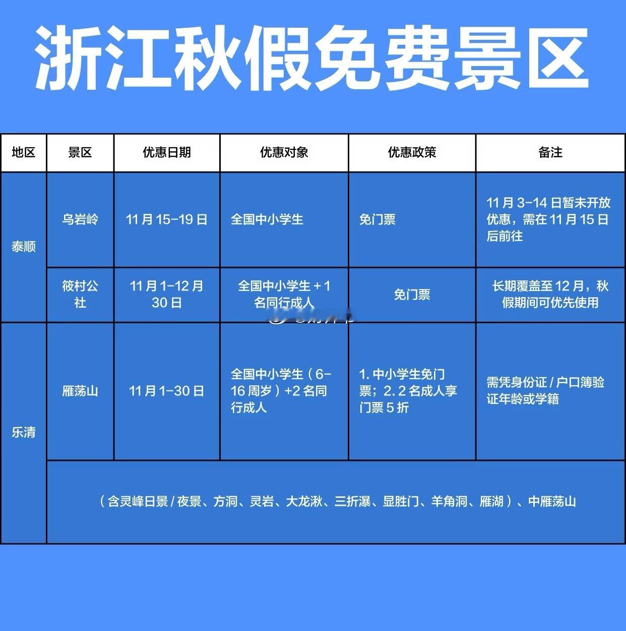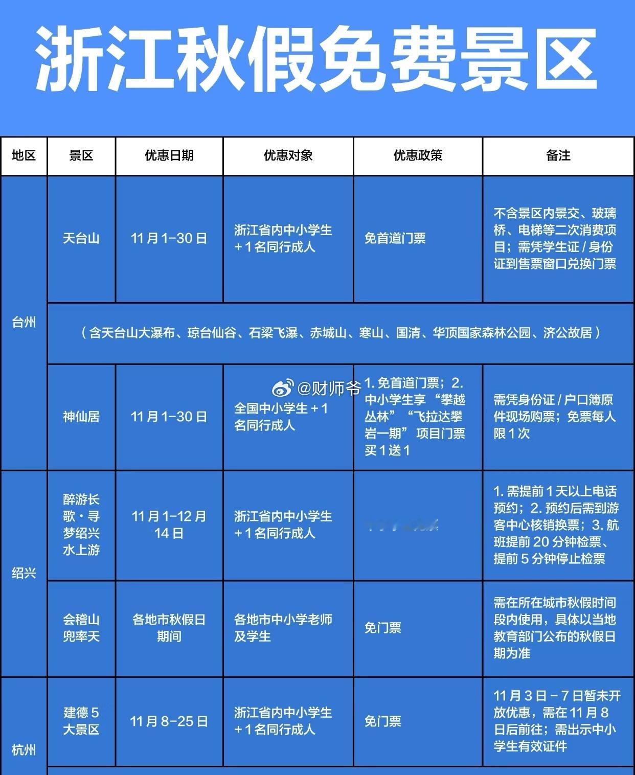 浙江省面向全国中小学生及家长,秋假免门票景区集合。[围观]