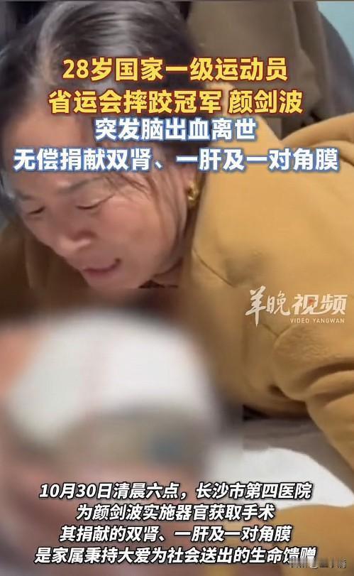 才28岁呀,人生才刚刚开始慢慢走向高光的时刻,真的太让人心痛了… 看到国家一级摔跤运动员颜剑波突发脑出血去世,母亲在病房奔溃抱着儿子,哭得已经没有力气了,还一边抚摸着儿子,这画面简直让人不禁眼眶红了。 脑出血,离我们并不遥远。 我也曾在医院康复科里看过因为脑出血,做了开颅手术的患者,他的脑袋因为做了手术是凹陷,万幸做完手术后经过治疗,还能被扶着走路,但平衡感会比较差,反应没有那么快,但是非常积极配合做康复训练,那种坚持让人感动! 在康复科遇到的人,更多是是脑梗患者在努力做康复,有的能扶着走路,更多的还是要坐着轮椅,可能经过几个月时间康复训练、针灸、理疗……就能慢慢走路了吧,这也是他们默默坚持下去的动力! 听医生说过,一般都是年纪较大的人,患有高血压、糖尿病的人容易出现这种情况,但年轻人也并非绝对安全。抽烟、喝酒、不规律作息、长期高压…都在增加风险。 每次从医院出来、都会更加觉得健康真的是一笔财财富,希望我们都能把自己照顾好、对自己的身体负责,不辜负每一天的清晨和黄昏。 好好爱护自己,就是对生命最好的回应! 愿我们都健康!