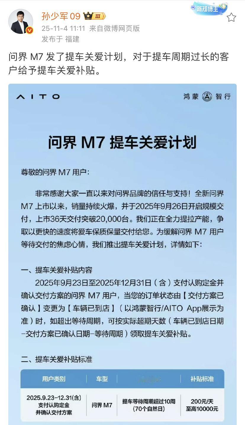 问界对等待M7超过10周用户,每天补贴200元! 也就是说这些人车辆没有拿到手,车辆就开始为你挣钱了,超过10周以后,每一天都会为你多挣200块钱。 当然呢,这是也是有时间限制的,最高50天也就是1万块钱为止。 相比较其他没有提供该类保障的品牌,问界品牌的措施非常的暖心。