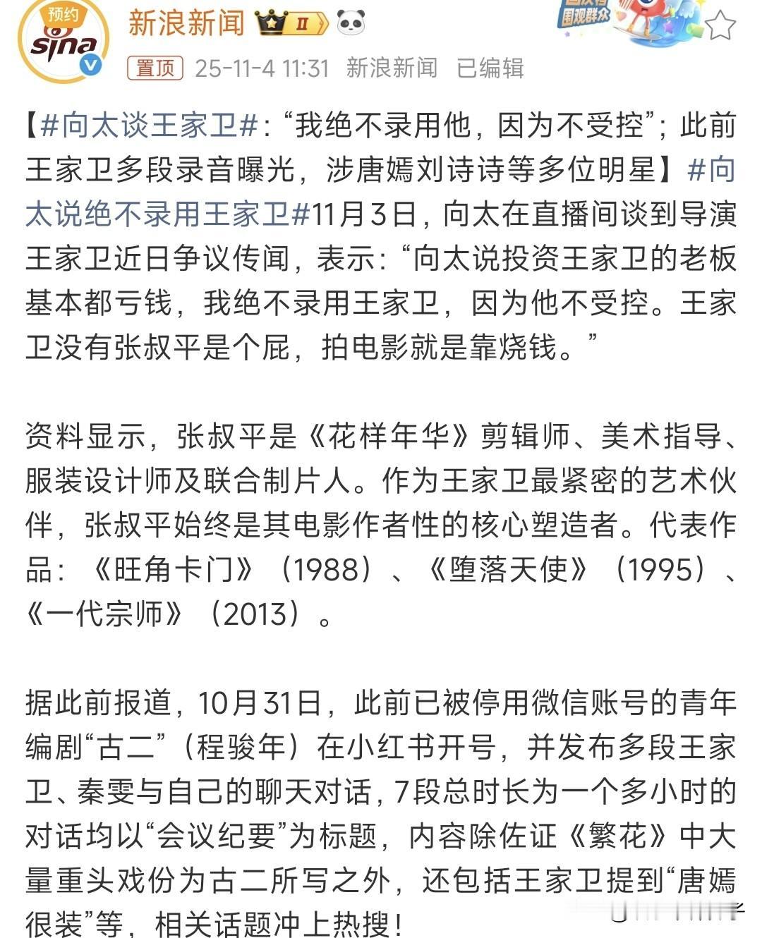 向太真不怕得罪人,说王家卫没有张叔平是个屁…… 11月4日,看到媒体报道,向太直