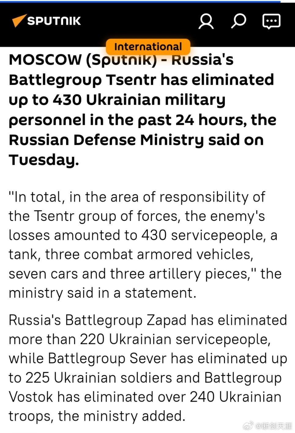 俄罗斯国防部补充说,俄罗斯的“Zapad”战斗群消灭了220多名乌克兰军人,“Sever”战斗群消灭了225名乌克兰士兵,“东方”战斗群消灭了240多名乌克兰士兵。