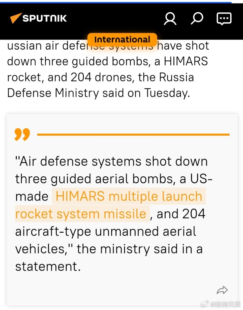 国防部在一份声明中说:“防空系统击落了三枚制导航空炸弹,一枚美制HIMARS多管火箭发射系统导弹和204架飞机型无人机。”