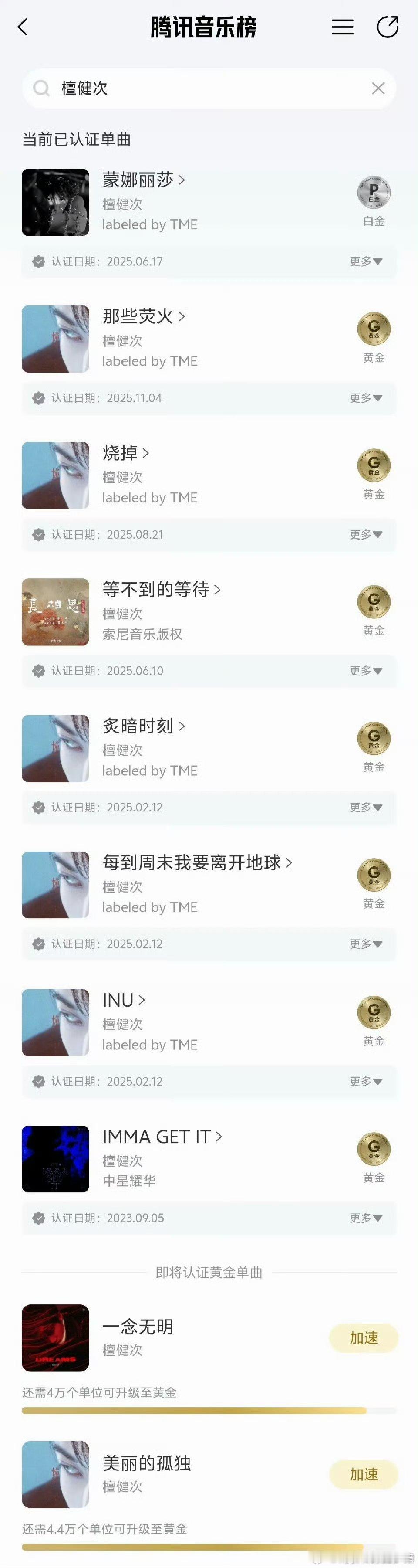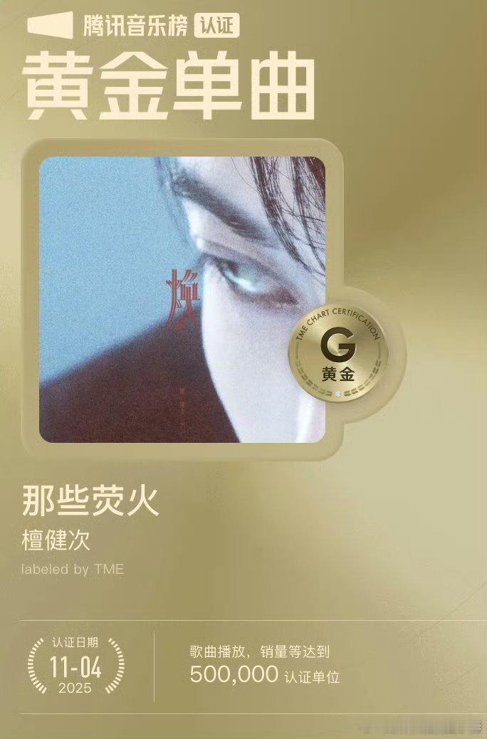 恭喜🎉🎉🎉檀健次《那些荧火》获得腾讯音乐榜黄金单曲!截至目前,檀健次已获得1首白金单曲,7首黄金单曲!