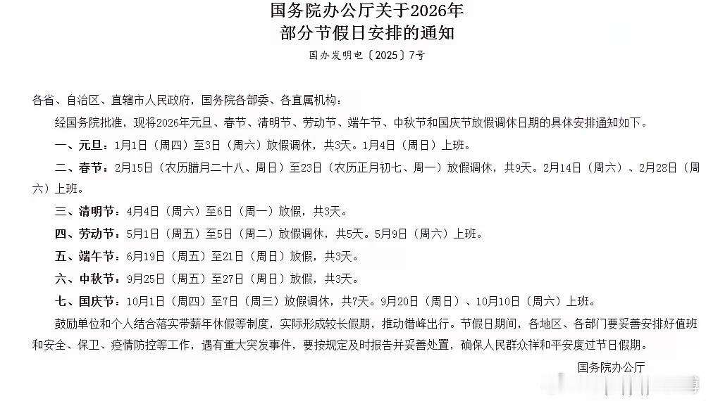 今年春节假期连续休9天,确实比往年多2天,从2月15日(周日,腊月二十八)开始到2月23日(周一,正月初七)结束。