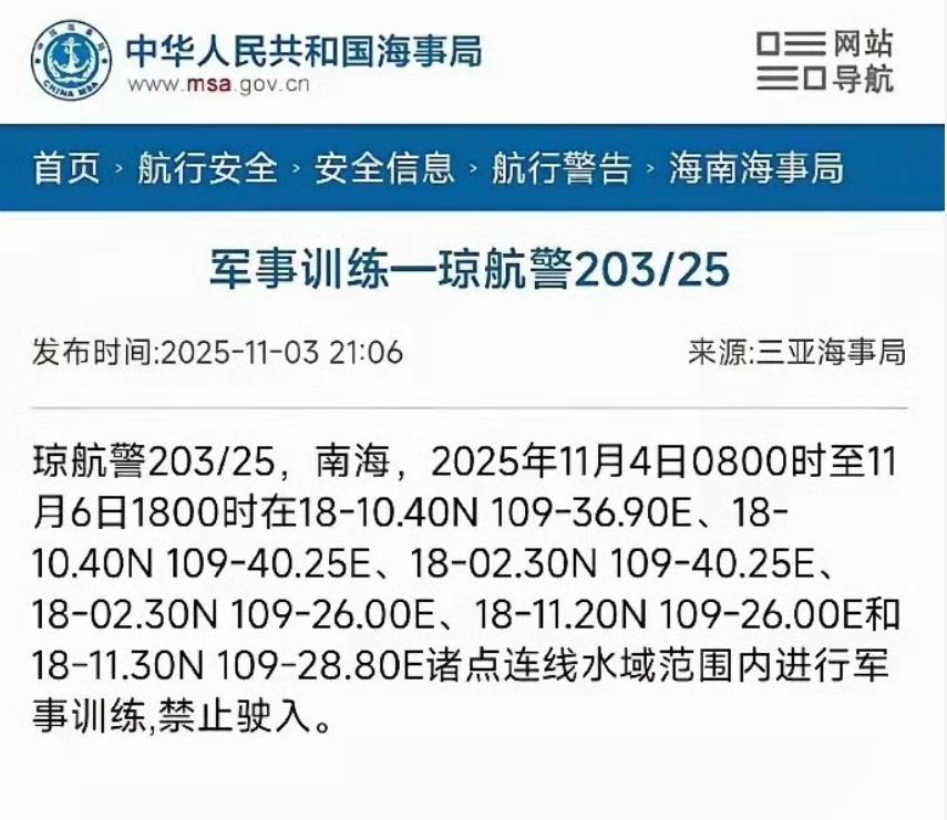 三亚军港观礼台已经搭建完毕,“山东”舰挂满旗,“福建”舰的交付时间应该就在明天或后天 根据最新的照片显示,“山东”号航空母舰已经挂满旗,观礼台的搭建也已经结束。今天海事局最新消息4日-6日相关海域(图3)有军事行动,该区域(图4)包含榆林军港及亚龙湾潜艇基地近海附近海域。所以“福建”舰的服役时间应该就是5号或者6号。这艘彻底改变西太海上格局的航空母舰将正式交付中国海军。 与“山东”舰交付不同的是,“福建”舰的交付仪式甲板上会摆放舰载机,而且会有不止1艘军舰服役。