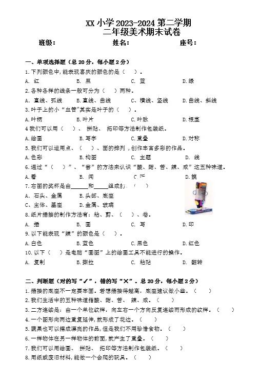 人教版美术二下|总复习资料+练习卷+答案