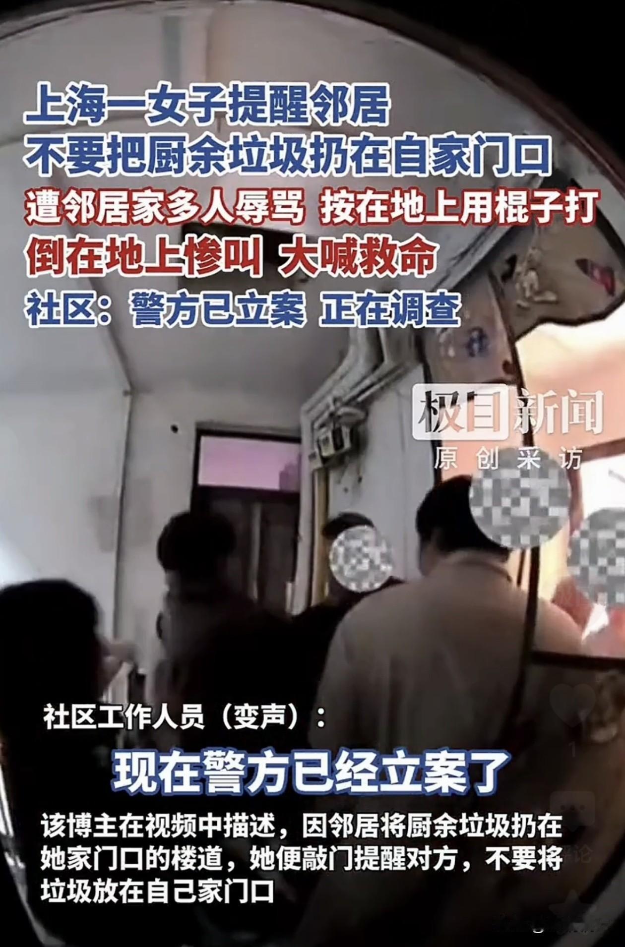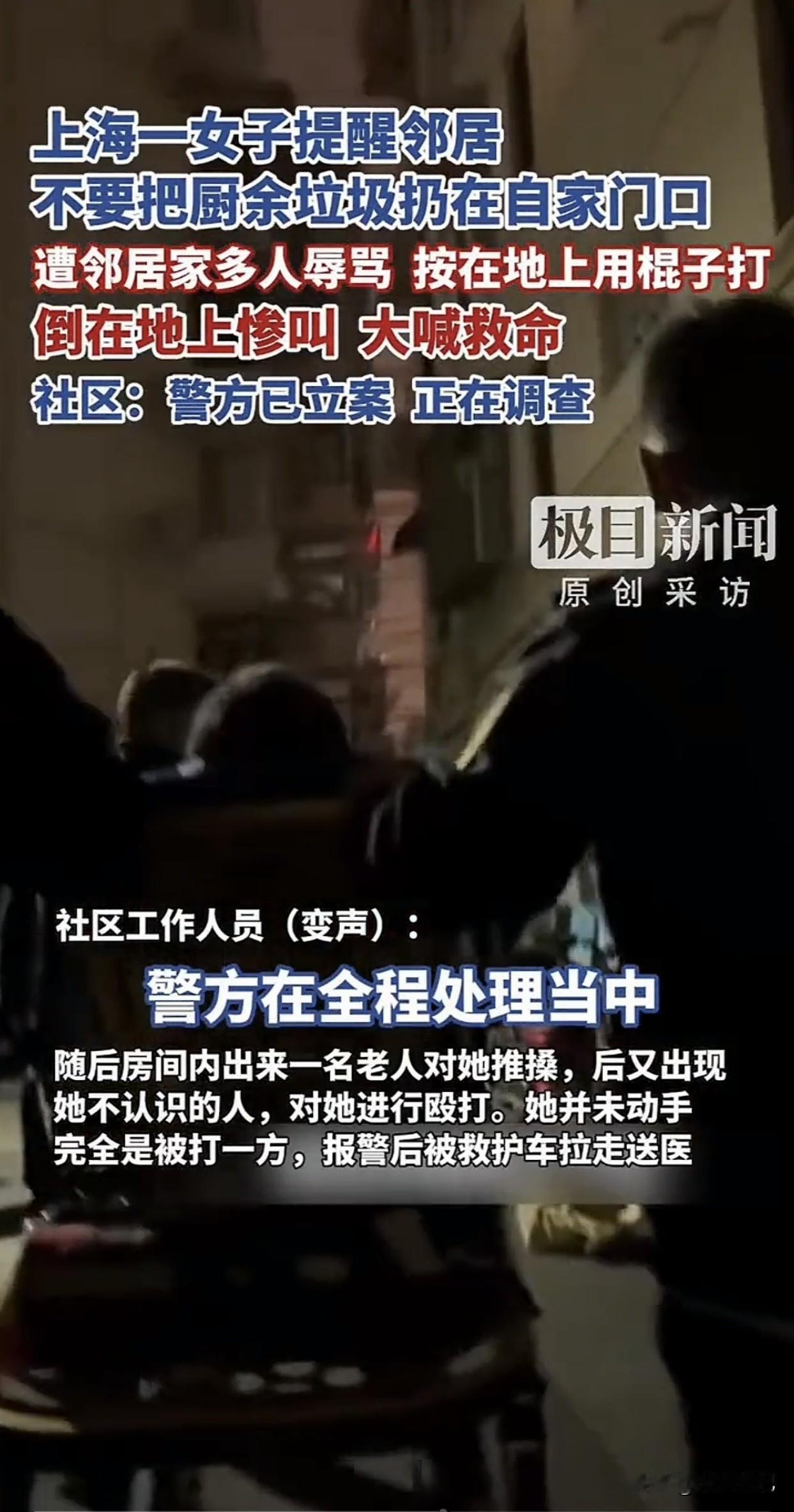 上海这事儿太炸了!就因为说了一句“别在我家门口扔垃圾”,一个姑娘被一家子围殴,看得我拳头都硬了! 你说这事儿离谱不?不是小说,不是电视剧,是真事! 上海一姑娘,租的房子,邻居老把厨余垃圾堆她门口,汤汤水水流一地,臭得整层楼都遭罪。她忍不了,11月1号晚上,就敲门说了一句:“垃圾别放我家门口啊。” 结果!门一开,一个老头冲出来,反手就推她,还大喊:“你不要推我!”——好家伙,倒打一耙是吧? 这还没完。 另一个老人上来拉扯,骂她“你敢打老人”! 最狠的是老头儿子,直接揪她衣领往屋里拖,往监控拍不到的墙角拽! 姑娘喊“有监控”,结果换来的是—— 掐脖子、按倒、拳打脚踢,还有人拿棍子往死里打!整整两分钟! 她喊救命,浑身是伤,最后救护车从六楼抬下来的,人都走不了了! 更气人的是,警察来了,这一家子还嚣张得很,指着她说“是她先动手”,当着警察面,又给她一拳! 监控都拍得清清楚楚,他们怎么敢?怎么敢这么无法无天?! 我们每天讲文明、讲素质,可有些人,根本不是素质问题,是恶! 你讲理,他装老;你维权,他装病;你有证据,他倒打一耙! 他们吃准了什么?吃准了你不敢惹,吃准了“老人”是护身符,吃准了社会总让老实人吃亏! 这姑娘说了,不接受调解。 我支持她!今天你退一步,明天恶就进十步! 要是没人敢说“不”,那楼道就是垃圾场,那家门口就是别人撒野的地盘! 评论区说说:要是你,你敢开口吗? 别再让善良的人,流血又流泪! 图片来源看图片 晒图笔记大赛 上海事事件 上海男子打女子 上海一女子殴打