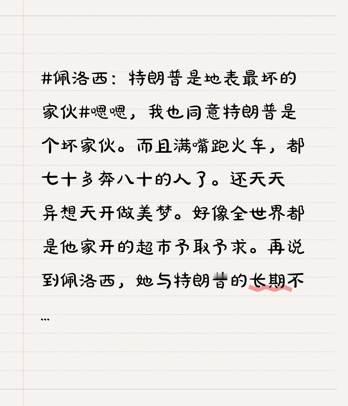 嗯嗯,我也同意特朗普是个坏家伙。而且满嘴跑火车,都七十多奔八十的人了。还天天异想天开做美梦。好像全世界都是他家开的超市予取予求。不过佩洛西也不是啥好玩意,当年窜访台湾就是她干出来的事。 再说说佩洛西和特朗普。他俩不和是长期公开的。包括2019年佩洛西推动对特朗普的两次弹劾,以及2020年特朗普发表国情咨文后,佩洛西当众撕毁讲稿。特朗普也多次攻击佩洛西,说她"精神有问题",并指控她涉及内幕交易。反正这俩人精神上都有点不正常,咱们能不和他们玩尽量不玩,他们闹他们的咱们躲远点就完了。