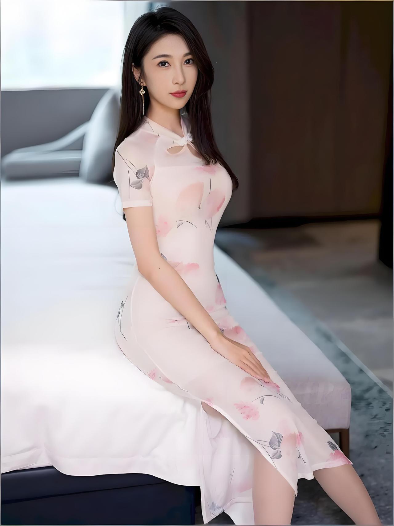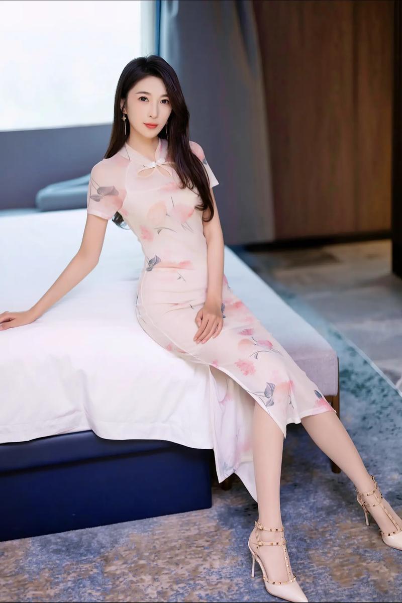 现代旗袍穿出优雅与时尚气息 粉色雪纺印花旗袍,整体造型端庄雅致,展现出传统与时尚融合的美感。 粉嫩精致花朵装饰,领口、袖口设计简约大方,线条贴合身形,凸显穿着者的优雅体态。传统立领与斜襟元素保留,同时融入现代剪裁,既延续了旗袍的经典韵味,又具备日常穿着的实用性。 整体风格偏向端庄温婉,粉色基调柔和百搭,图案细节增添层次感,避免了传统旗袍的沉闷,适合多种正式或半正式场合,如文化活动、日常通勤等,兼具传统美学与现代时尚感。 此类旗袍可搭配简约头饰(如珍珠发簪)提升传统气质,或搭配金属质感饰品增加现代感; 选择细跟高跟鞋能延长腿部线条,进一步凸显身材比例,适配“高跟鞋配玲珑身材”的时尚搭配思路,帮助穿着者展现自信从容的气场。 旗袍古典新中式