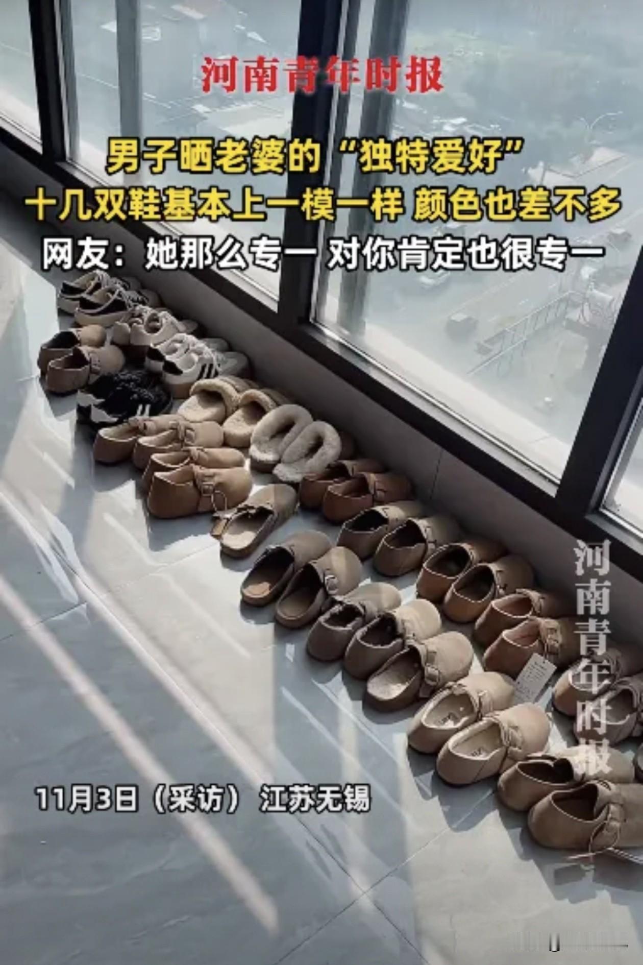 “太尴尬了!”近日,江苏无锡,一男子闲来无事整理老婆的鞋子,结果发现同样颜色同样款式的鞋子,老婆竟然一口气买了15双!男子看到后惊呆了直呼老婆的爱好“很独特”,网友:对鞋专一就是对人专一啊。 这事儿我刚刷到的时候,以为是段子,结果点进去一看,真有这事儿,主角是无锡的孙先生。 江苏无锡的孙先生最近干了件大事——整理家务。 本以为就是擦擦桌子扫扫地,结果一不小心,把自己整成了“网红”。 他闲来无事,想把家里鞋子归归位,越收拾越不对劲: 鞋柜有,床底有,凳子下有,沙发边还有…… 全是一种看着“长得像亲兄弟”的勃肯鞋。 他越找越多,最后往客厅一摆——好家伙,整整15双,排得整整齐齐,像在开鞋界“阅兵仪式”。 孙先生当场震惊:“咱家是开鞋店的吗?!” 他发视频吐槽:“这鞋在我眼里,简直就是Ctrl+C和Ctrl+V出来的,买这么多,不浪费吗?” 结果评论区炸了,清一色站老婆: “兄弟,你根本不懂女人的鞋!” “这不是15双鞋,是15种生活场景的精准适配!” “你看到的是‘一样’,她看到的是‘春夏秋冬、通勤遛娃、配裙配裤’的完整穿搭体系!” 仔细一扒,真相惊人—— 有的是单层,透气清爽,春秋穿; 有的加了薄绒,初冬御寒; 有的厚绒加满,冬天出门像踩在暖宝宝上; 还有全包头、半包头、带扣、无扣、深咖、浅咖、3厘米跟、2.8厘米跟…… 连鞋头弧度都差那么一丢丢。 在男人眼里是“复制粘贴”, 在女人眼里,这是“每双都不可或缺”的足下装备库。 有网友神评: “这叫‘精准囤积’,不是败家,是理性消费!” “懂了,下次我买10把螺丝刀,也说这是‘工具界的穿搭哲学’。” “老公:一模一样。老婆:你根本不懂我的鞋!——这剧本太熟悉了。” 说到底,这不是鞋的事,是男女审美的终极鸿沟。 男人觉得“够用就行”, 女人觉得“每种场景都得配对的鞋”, 就像男人衣柜里十件白T,女人却要分“外搭纯白、内搭米白、约会奶白、健身灰白”…… 最后孙先生也服了: “算了,她开心就好,反正鞋没买在我脚上。” 评论区聊聊:你家有没有这种“在外人眼里一样,主人眼里千差万别”的收藏? 比如老公的球鞋、老婆的口红、娃的乐高…… 快来晒,让我们看看谁家的“找茬游戏”最难! 图片源于网络