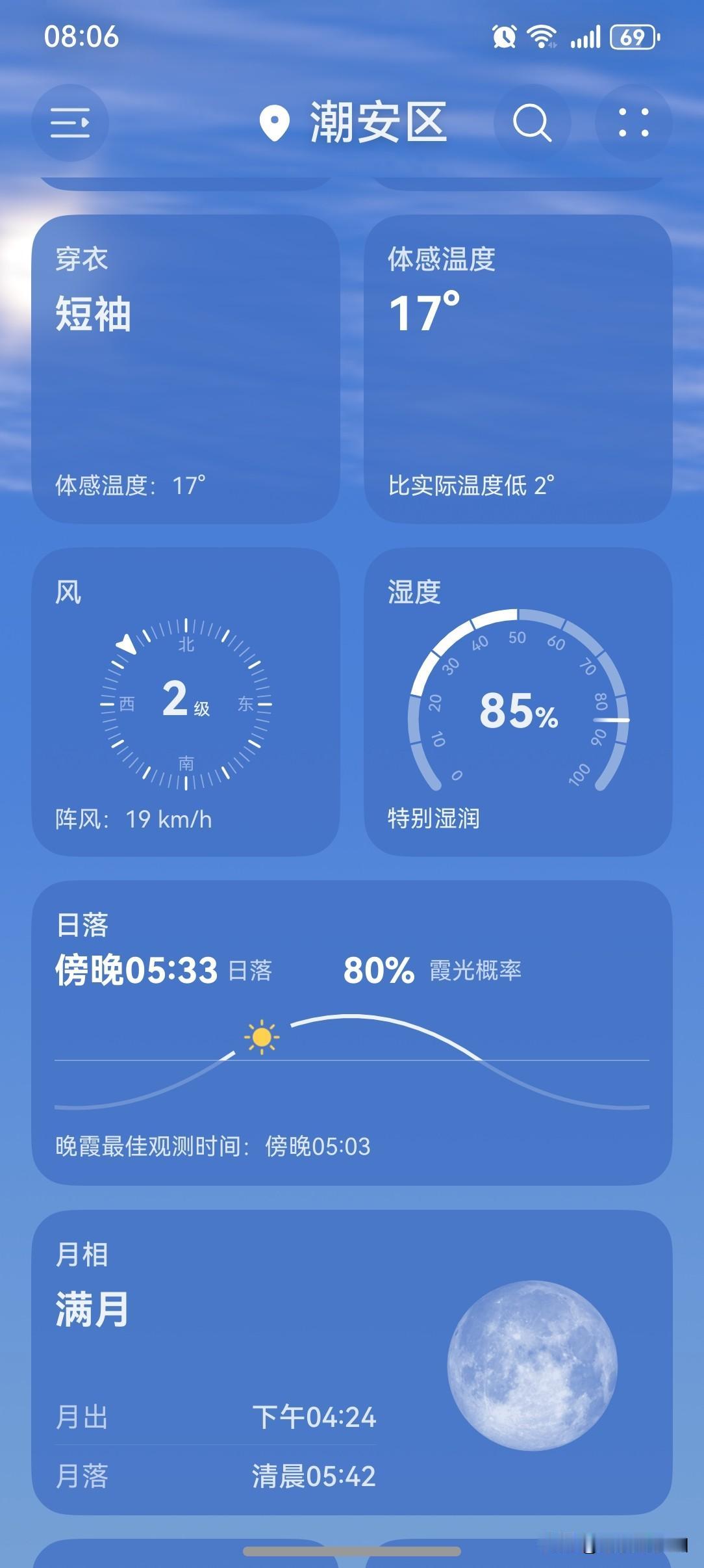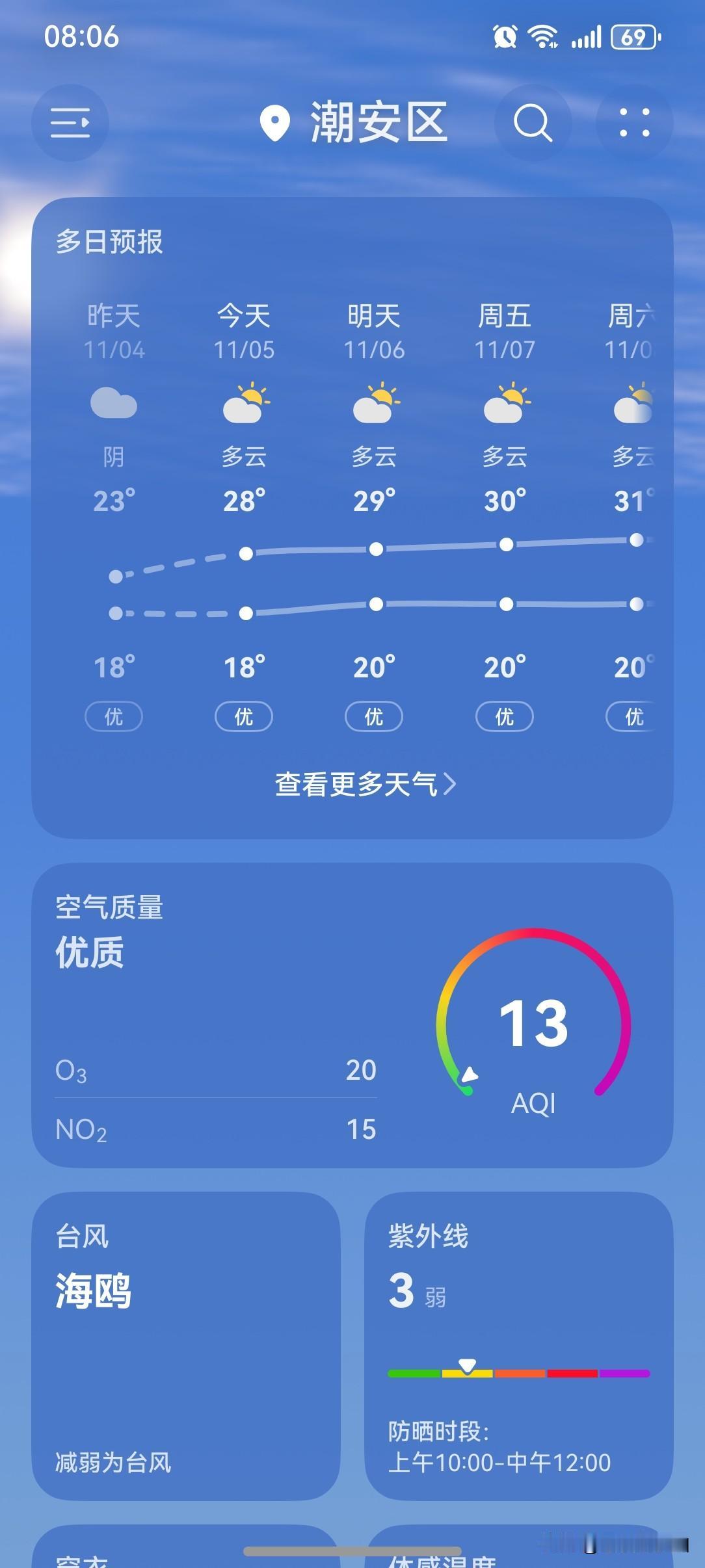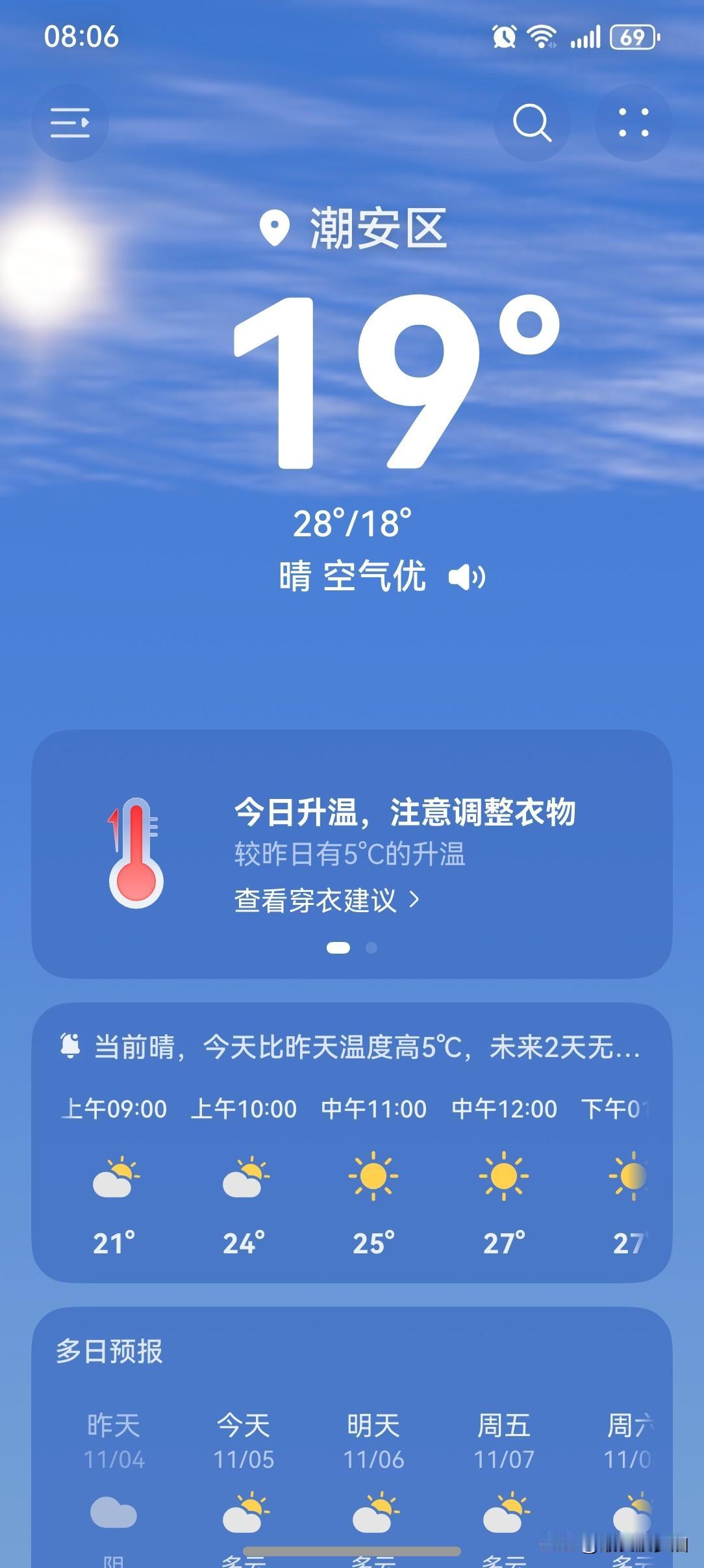 “冷空气+雨水”搭配的清凉套餐, 你感到满意吗? 未来几天, 广东降水减弱,气温回升! 5~6日, 我省降水减弱,云量逐渐减少, 气温回升; 7日, 珠三角南部和粤西大部市县阴天有小雨, 其余 县多云为主。 另外, 今年第25号台风“海鸥”已于今天(5日)早晨移入南海, 预计, “海鸥”将向西偏北方向移动, 强度逐渐加强。 未来3天, 我省海面有东北风6~7级阵风8~9级。 今天(4日), 潮州喜提一个多云天气, 气温18~28℃, 此刻气温19℃, 体感温度17℃。 早上的北风貌似比昨天又大些, 体感更加清凉, 瞬间感觉自己又年轻了, 因为又被冻得跟孙子似的。 看看今天的天空, 阳光灿烂, 即将迎来气温回升, 又是一片暖洋洋! 今天的天气, 如果按照满分💯来算的话, 应该也能获得90分, 凭实力获得一个五星好评! 如此天气! 元芳,你怎么看? [捂脸][捂脸][捂脸][捂脸][捂脸][捂脸][捂脸][捂脸]
