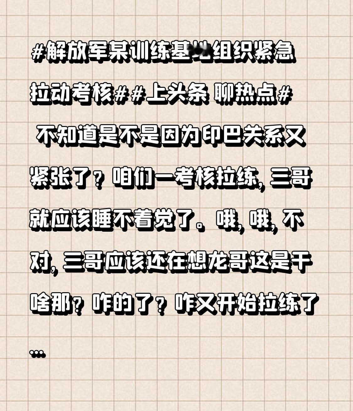 不知道是不是因为印巴关系又紧张了?咱们一考核拉练,三哥就应该睡不着觉了。哦,哦,不对,三哥应该还在想龙哥这是干啥那?咋的了?咋又开始拉练了?应该没我啥事,接着回家睡觉吧。