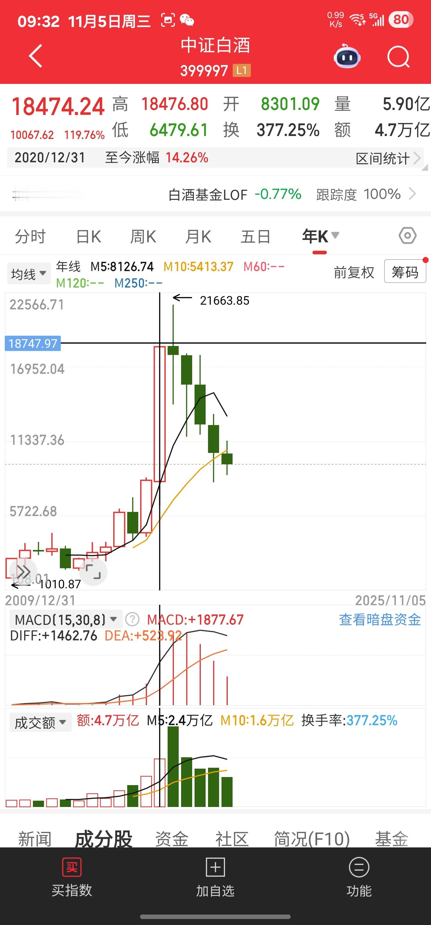 白酒在2020年创下的的单年120%记录,还是年尾收在最高点,真是太强了。但2020年后最强的指数又创下5年连跌。
