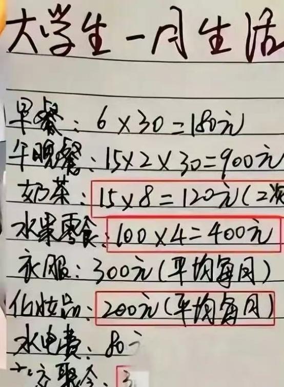大学女生哭诉,父母一个月只给1500的生活费,根本不够。而她晒出的生活费清单,让网友炸锅了!网友:没有公主命,就不要得公主病!既然出生在普通家庭,就要多体谅父母的不易,学会感恩和节俭!   原本听到女大学生的哭诉,大家的第一反应都是责备女生不懂事。可是当看到女孩晒出账单后,网上渐渐出现了不同的声音。   有人痛心疾首地批判她:“没有公主命,偏得公主病!”也有人无奈地感慨:“时代变了,1500在一线城市真的寸步难行。”   一张小小的账单之所以能引发全网热议,是因为这场争论早已超越了生活费本身,逐渐演变成了当代社会最尖锐的矛盾:两代人对金钱、苦难和尊严的不同理解。   那些批评的声音当然不能忽视。毕竟清单上刺眼的“奶茶零食”、“社交娱乐”和“护肤品”,立刻能让人联想到含辛茹苦的父母。   在传统价值观里,吃苦是成长的必修课,节俭是永恒的美德。他们无法理解,为什么如今的孩子明明什么都不缺,却还是觉得不满足。   这种批评背后,或许隐藏着深深的担忧。担心年轻的一代失去奋斗精神,也害怕自己的付出被视作理所当然。   然而,简单地用“不懂事”来概括一切,也有失公允。今天的大学校园,早已不是几十年前的模样。它不仅仅是一个读书的地方,更是一个微缩的社会。   当整个班级的同学计划一次聚餐,当不化妆就被视为不够精致,当社交成为信息获取和情感连接的必需品时,要求一个年轻人在集体中完全独善其身,似乎太“不近人情”了些。   或许这个女大学生的委屈,更多的是来自那种被孤立、被排斥的恐慌,而不是真的物质上的匮乏。对于一个正值青春期的女孩子来说,那种“别人都有,我不能有”的羞耻感,足以摧毁一个年轻人的自信。   而每个月1500元的生活费,就像一个导火索,引爆了长期隐藏在家庭关系中、极容易被忽视的问题。   有多少父母,只是机械地转账,却从未告诉孩子,这笔钱是如何赚来的?又该如何规划着花出去?父母期望孩子无师自通、学会节俭,却忘了自己也是在社会摸爬滚打多年后才懂得生活不易。   另一边,许多孩子心安理得的生活在父母构建的“安全屋”里,从未想过主动去了解家庭的真实负担。双方永远都活在不同的“信息差”里,最终形成了越来越深的矛盾和互相之间的不离间。   更值得深思的是,在这场争论中,“勤工俭学”这个选项常常被当作解决问题的万能钥匙抛出来。   但这把钥匙在今天的环境下是否依然万能?大学课程的压力、内卷的竞争,使得学生能够自由支配的时间越来越碎片化。能找到一份有意义的兼职,并且平衡好学业,并非易事。   所以,大学生的生活费到底应该给多少?又该怎么给?对此你有什么看法?欢迎在评论区留言讨论。生活费大学生   文|墨海 编辑|史叔