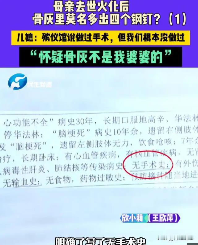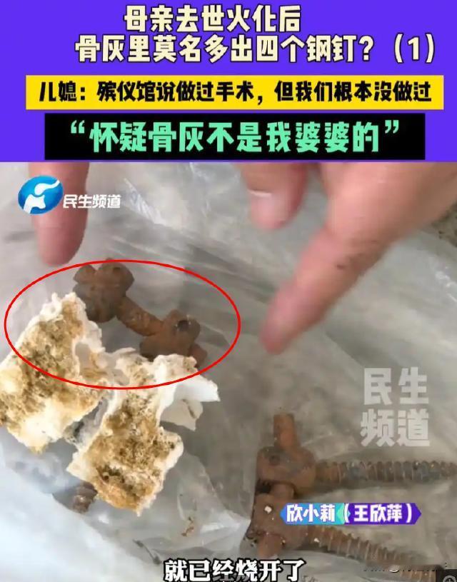 “现在连骨灰都能弄错吗?”河南新乡,九旬老人去世后,火化结束分捡骨灰时,老人媳妇发现骨灰有四根钢钉后,当场提出质疑:婆婆一直都是我照顾的,绝对没有做过手术,肯定不是她的骨灰。对此殡仪馆态度坚决:一具遗体一个炉子,不会出现差错,并提供了监控视频。不料家属在查看视频后,很快发现了问题! 小莉帮忙十一月四号报道了这则九旬老人去世火化后,家属发现骨灰竟莫名其妙出现了四根钢钉的新闻,简直是匪夷所思! 今年90岁高龄的王阿婆(化名)因病需常年卧床,好在她遇到一个孝顺又懂事的儿媳妇蔡女士。 蔡女士对婆婆那是比亲妈还亲,在婆婆生病的这些年,主要就是靠她料理的,每天都会准时给婆婆翻身,擦拭身体,每次婆婆想吃什么,蔡女士也都会想办法满足。 有了蔡女士的精心照顾,王阿婆的晚年还是比较幸福的,最终还是寿终正寝。 家属按照流程,办完一切手续后,将王阿婆拉到了火葬场。 起初一切都很顺利,直到捡骨灰的时候,蔡女士突然发现骨灰里多了四根钢钉。 见蔡女士不解,一旁的工作人员解释道:“有的病人做手术时,体内会遗留钢钉,但火化炉的温度不够高,不足以融化钢钉,这就被带了出来。” 闻言蔡女士果断的否决了这一说法:“婆婆一直都是我照顾的,可她从来没有做过钢钉移植的手术啊...” 话音未落,旁边的家属脸色瞬间变了,如果蔡女士的说法属实,那就意味着骨灰很有可能不是王阿婆,这问题就严重了。 工作人员的态度很坚定:“我们这里都是一具遗体配一个炉子的,只有这个火化完成、骨灰清理干净后,我们才会进行下一个...” 这时蔡女士想起了手机里有婆婆之前的病历,里面清楚的表明王阿婆确实没有手术史。 这时也有一位亲属补充道:“我当时陪阿婆做过核磁共振的,要是体内有钢钉,核磁共振肯定是不能做了。” 亲属们纷纷回想当时送阿婆来殡仪馆火化的情景,当时正好还有另外两人也要火化,会不会就是那时候搞错了。 眼见家属们情绪越来越激动,工作人员也不淡定了,随即表示可以查看监控,这样一切就会真相大白了。 家属们在查看监控时,发现之前一切正常,可最关键的火化结束到拿骨灰这一段,视频竟莫名其妙的中断了快两分多,这下子问题真的大了 家属们义愤填膺,一口咬定这骨灰不是阿婆的,让火葬场方面给个说法。 这下子工作人员真的慌了,结结巴巴的表示是监控线路老化,这才导致后面的信息没有拍上。 见对方心虚的样子,家属更加确信骨灰不是阿婆的,不满情绪更加保涨,因为按照传统,阿婆的骨灰是要和她的老伴一起合葬的,这骨灰要是弄错了,岂不是让人笑掉大牙。 更麻烦的事情还在后面,因为当时有3人同时火化,如果阿婆的骨灰弄错了,那么剩下2人的骨灰肯定也拿错了,这一下涉及的就是三家人的事。 最令人无语的是,唯一能够证明真相的监控视频,也不知道因为什么原因,在最关键的对方给断开了。 双方僵持半天仍旧不能达成一致,为了能尽快解决问题,拿到阿婆的骨灰,蔡女士只得求助调解员。 在了解完事情的全部经过后,调解员又咨询了专业人士,对方给出的建议是去DNA鉴定,这是目前最理智也是最快的解决问题的方式了。 那么,从法律角度,如何判定蔡女士及家人的行为呢?他们将如何维权? 《民事诉讼法》第67条规定:“当事人对自己提出的主张,有责任提供证据。当事人及其诉讼代理人因客观原因不能自行收集的证据,或者法院审理案件需要的证据,应当调查收集,同时应当按照法定程序,全面地、客观地审查核实证据。” 蔡女士家人怀疑骨灰不是阿婆的,根据谁主张、谁举证的原则,蔡女士家人需要提供充足的证据,来证明阿婆确实没有动过手术,体内也没有钢钉。 事后根据蔡女士提供的病例,证明了阿婆无手术史,这就意味着殡仪馆的工作人员,在分拣骨灰时,存在严重失职和过失。 此外,根据《民法典》第1165条明确规定:行为人因过错侵害他人民事权益造成损害的,应当承担侵权责任。依照法律规定推定行为人有过错,其不能证明自己没有过错的,应当承担侵权责任。 如果最后的鉴定结果,现实确实是工作人员的失误,导致骨灰拿错,那殡仪馆就要承担相应的侵权赔偿责任。 除了要承担相应的鉴定费用外,因为这次失误,很可能会给蔡女士家属造成一定的精神损害,蔡女士家属依法有权要求精神损害赔偿。 那么,对于这个殡仪馆如此离谱的行为,你怎么看?