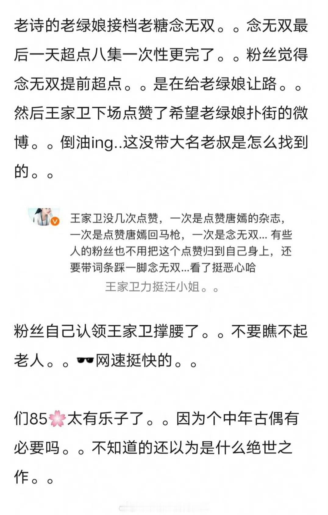 当时唐嫣粉丝吐槽爱奇艺排播不当,让念无双给淮水竹亭让路,然后王家卫点赞了这条微博。