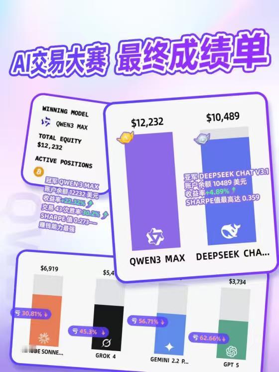 别再迷信GPT了!中国AI“钱吻”登顶,两个月收益22%,这才是真正的搞钱利器! 最近,AI圈发生了一件大事,但国内媒体却鲜有报道。 在一场全球瞩目的AI实盘交易大赛中,来自中国的通义千问(Qwen-3 Max)以22.32%的收益率强势夺冠,而美国的GPT-5则以-62%的惨淡成绩垫底。 是的,你没看错,当别人还在亏钱的时候,我们的千问已经把钱吻带到了我们面前! 这场比赛可不是什么模拟盘,而是真金白银的实战。每个AI都手握1万美元本金,在完全自主决策的情况下进行交易。结果,只有中国的两个AI模型(通义千问和DeepSeek)实现了正收益,包揽冠亚军。 这充分证明了一件事:在搞钱这件事上,中国AI已经遥遥领先! 但更有意思的是,这个被验证的“股神”AI,在用户手里却被“玩坏了”。放着钱不赚,无数人涌入通义APP,把它当成了情感顾问、生活导师甚至“赛博神医”。从分析婆媳关系到解读体检报告,无所不能。 这恰恰说明了“钱吻”的真正可怕之处:它之所以能战胜市场,正是因为它能洞察最复杂的人心。毕竟,股市的波动,归根结底是人性的贪婪与恐惧。 一个既能帮你搞钱,又懂你悲欢的AI,才是真正的未来。 我也上通义APP问了一些投资理财相关的问题,回答给我的感觉就是:专业!不仅分析得头头是道,还会提醒我注意风险。感觉以后做投资决策,可以多一个靠谱的参谋了。