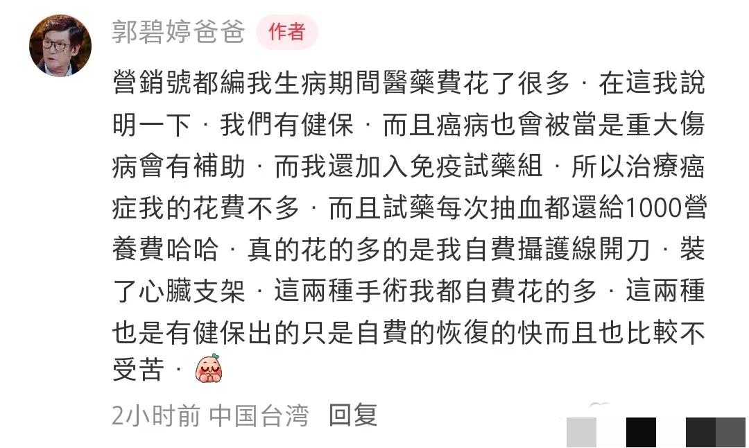 郭碧婷父亲被向太逼急了,决定澄清自己,他说自己治病有医保和进入试药组没有用女儿郭碧婷太多钱。 向太一直在网上说郭碧婷挣钱养了娘家,她的强势态度深深刺痛了郭碧婷爸爸的心,他终于发文回复了他治病的费用和经过。 他说癌症属于大病,有社会补助而且他有健保还加入了免疫试药组。并且强调试验抽血后还有1000元补助。装心脏支架确实花了点钱。