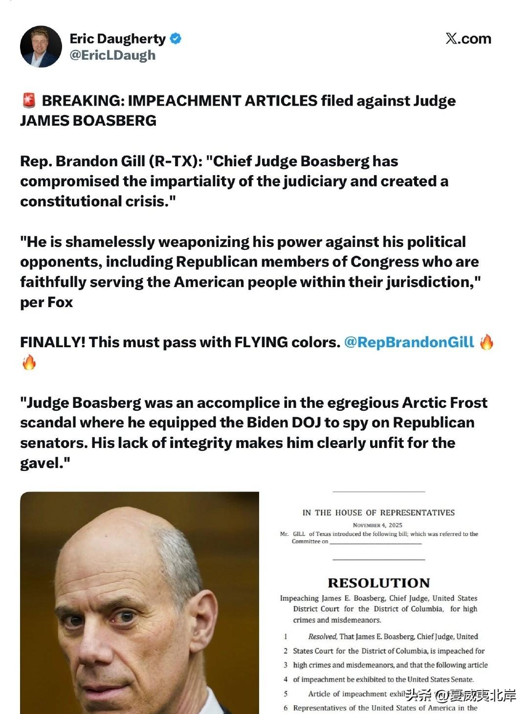 突发消息:弹劾条款已提交,针对法官James Boasberg德克萨斯州共和党众议员Brandon Gill: “Boasberg首席法官已经损害了司法的公正性,并引发了一场宪法危机。” “他正在无耻地利用其权力打击他的政治对手,包括那些在各自职权范围内忠诚为美国人民服务的共和党国会议员。”福克斯新闻报道。 “终于来了!这项弹劾必须以压倒性的优势通过。” “Boasberg法官是‘北极霜冻(Arctic Frost)’丑闻的共犯,在该事件中,他协助拜登领导的司法部监视共和党参议员。他缺乏诚信,显然不适合执掌法槌。”