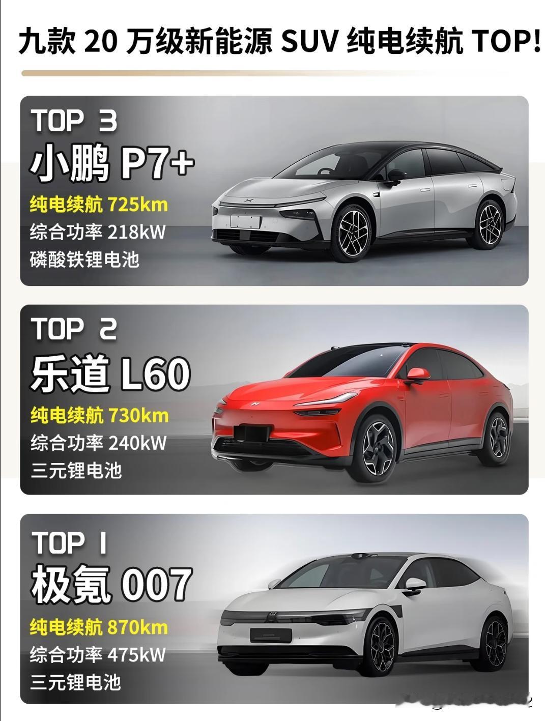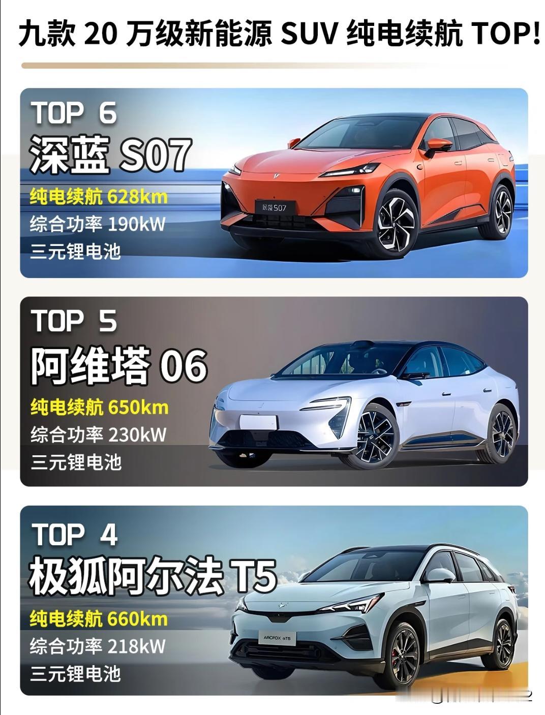 20万左右新能源SUV 续电最强都有谁? 整理了20万左右纯电SUV的续航王者榜单,从第九到第一,每款都各有亮点! 10名外选手先pass,直接看前9!续航501km起,最高直接到870km,再也不用怕长途续航而焦虑😟! 1.钛3的800V高压平台+可扩展车顶太好了,13万多就能拿下! 2.注重家庭实用性的,零跑C11的五连杆后悬架+真皮加热座椅,舒适性满满的。 3.宋PLUS新能源就不用多说了,DiPilot智驾全系标配,三口之家日常代步+短途出游都合适! 4.科技控一定要看看深蓝S07和阿维塔06!华为乾崑智驾+55英寸HUD,L2.5级智驾+华为音响; 5.想偶尔轻度越野的,极狐阿尔法T5的19°接近角+1546L大后备厢,家用越野都可以! 追求长续航和性能的,直接冲前三! 小鹏P7+,乐道L60,极氪007封神,预算充足的性能控闭眼入! 新能源汽车排行 新能源销量排名 新能源车续航 新能源实测续航 纯电续航对比 纯电车销量排名 纯电销量排行榜