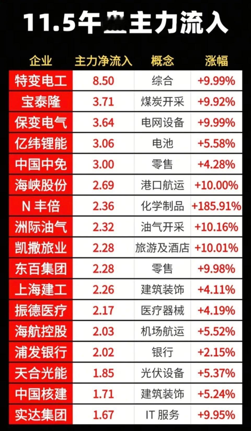 1. 特变电工icon:主力净流入8.50,概念综合,涨幅9.99%。作为综合能源巨头,覆盖输变电、煤炭、新能源等业务,受益于能源基建需求与多板块协同发展,主力大幅流入并涨停,凸显市场对其“能源全产业链”布局的认可。