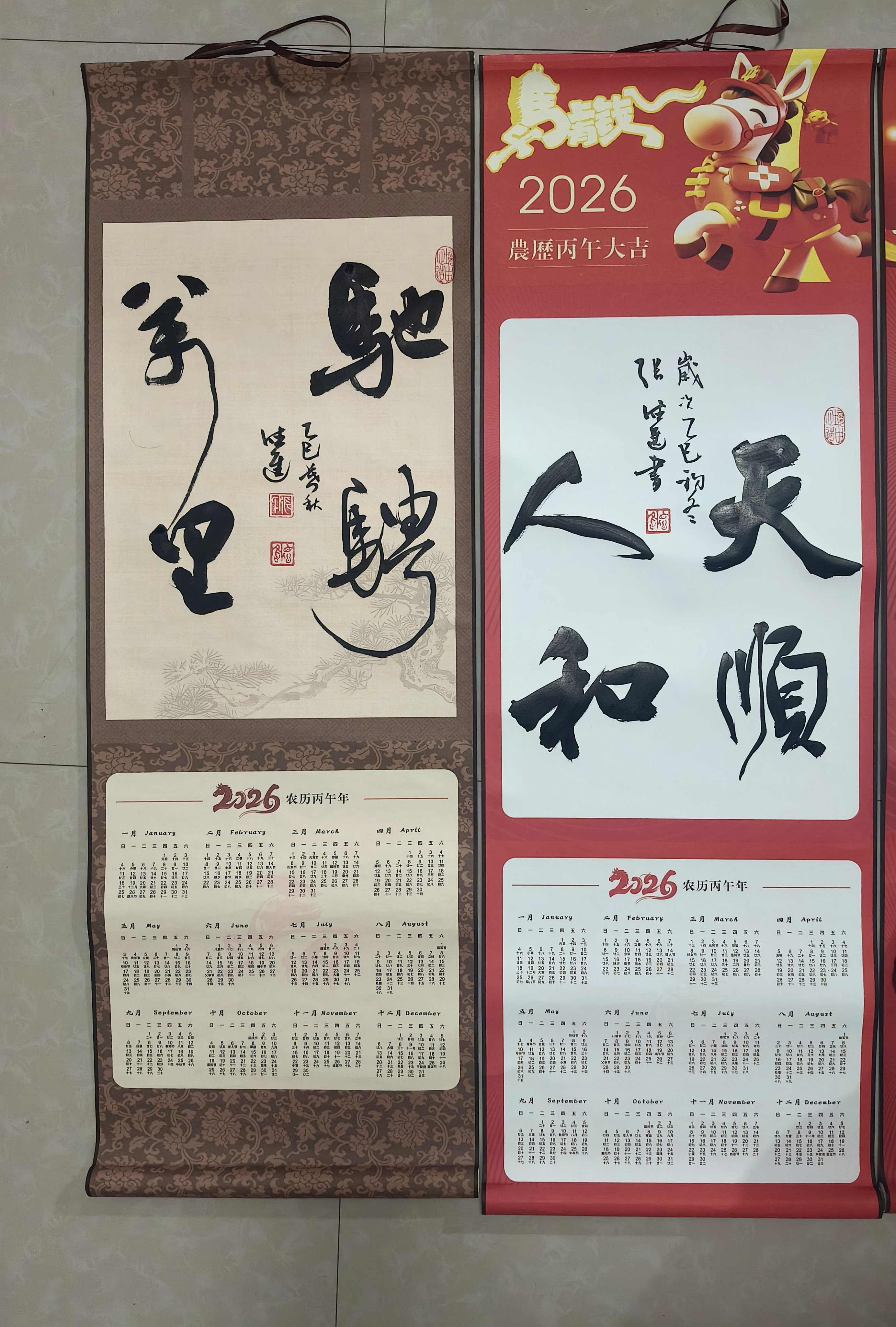2 温馨版:挂历上的书法,是时光的注脚。写 “朝暮皆安” 护四季,书 “岁岁常欢” 暖日常,墨色晕染间,让平凡的日期有了温度,翻页时见字如晤,日子也跟着慢了、暖了。