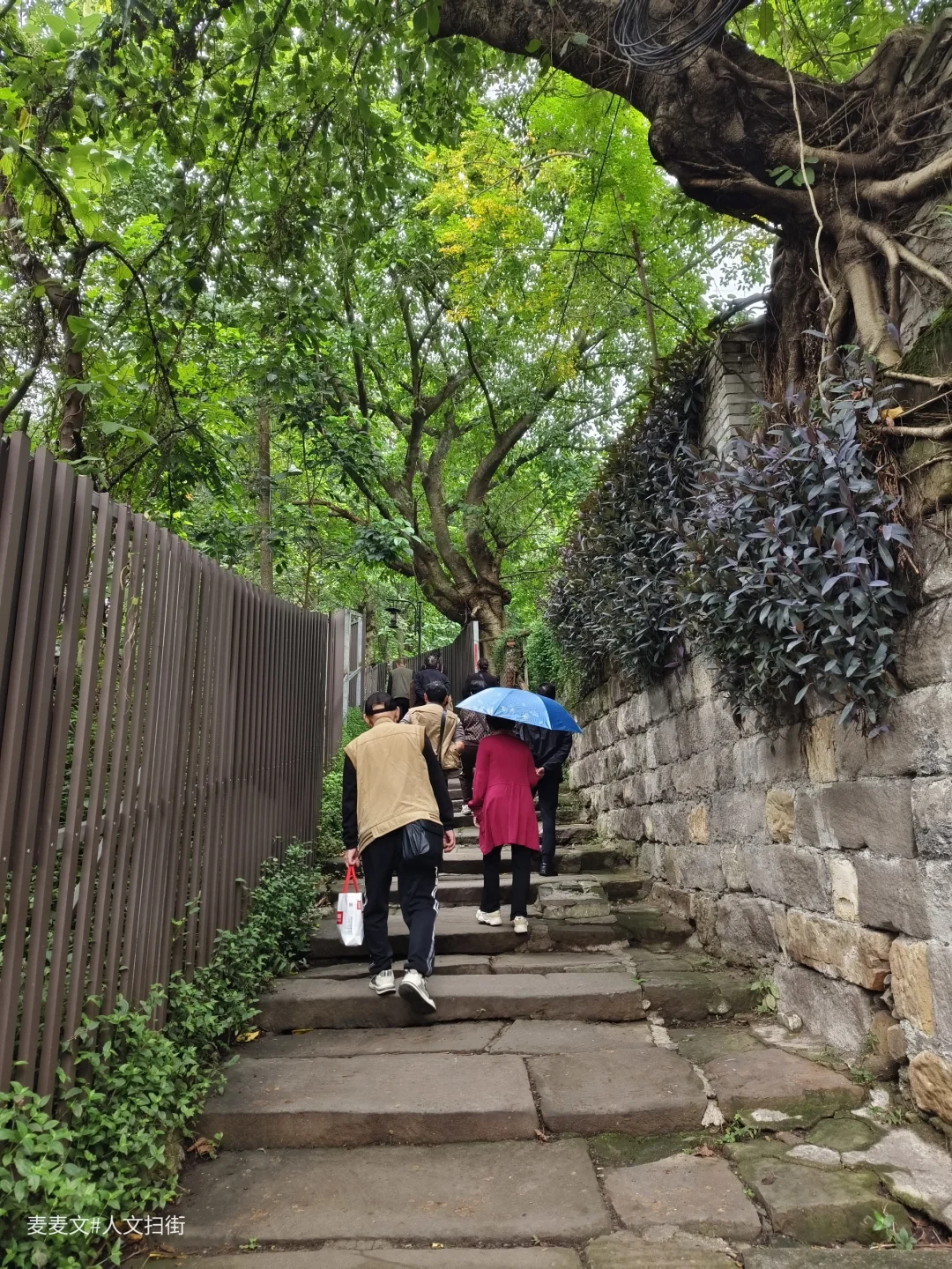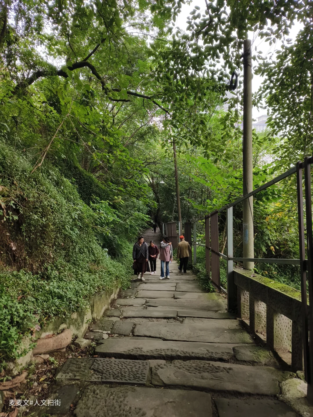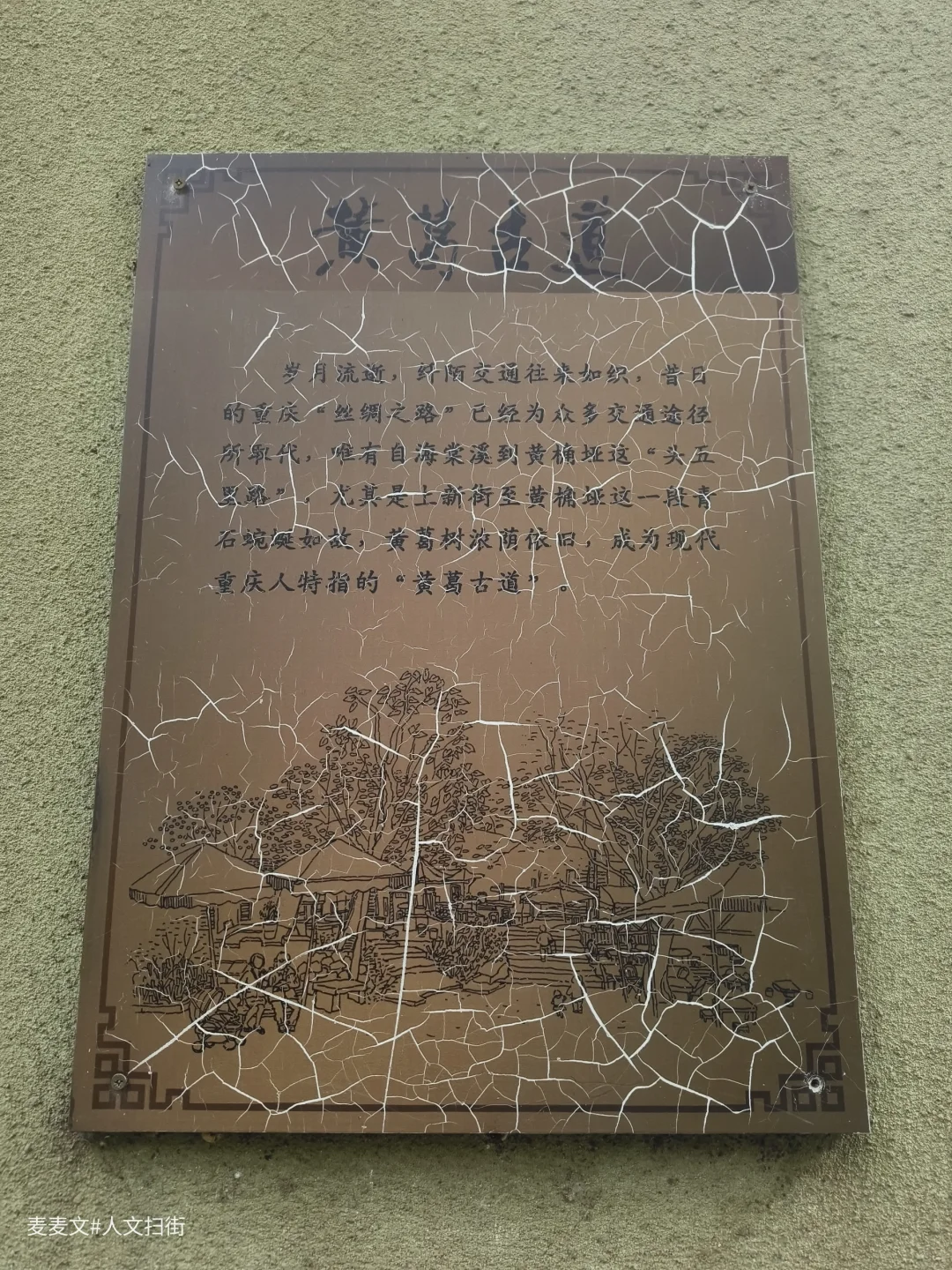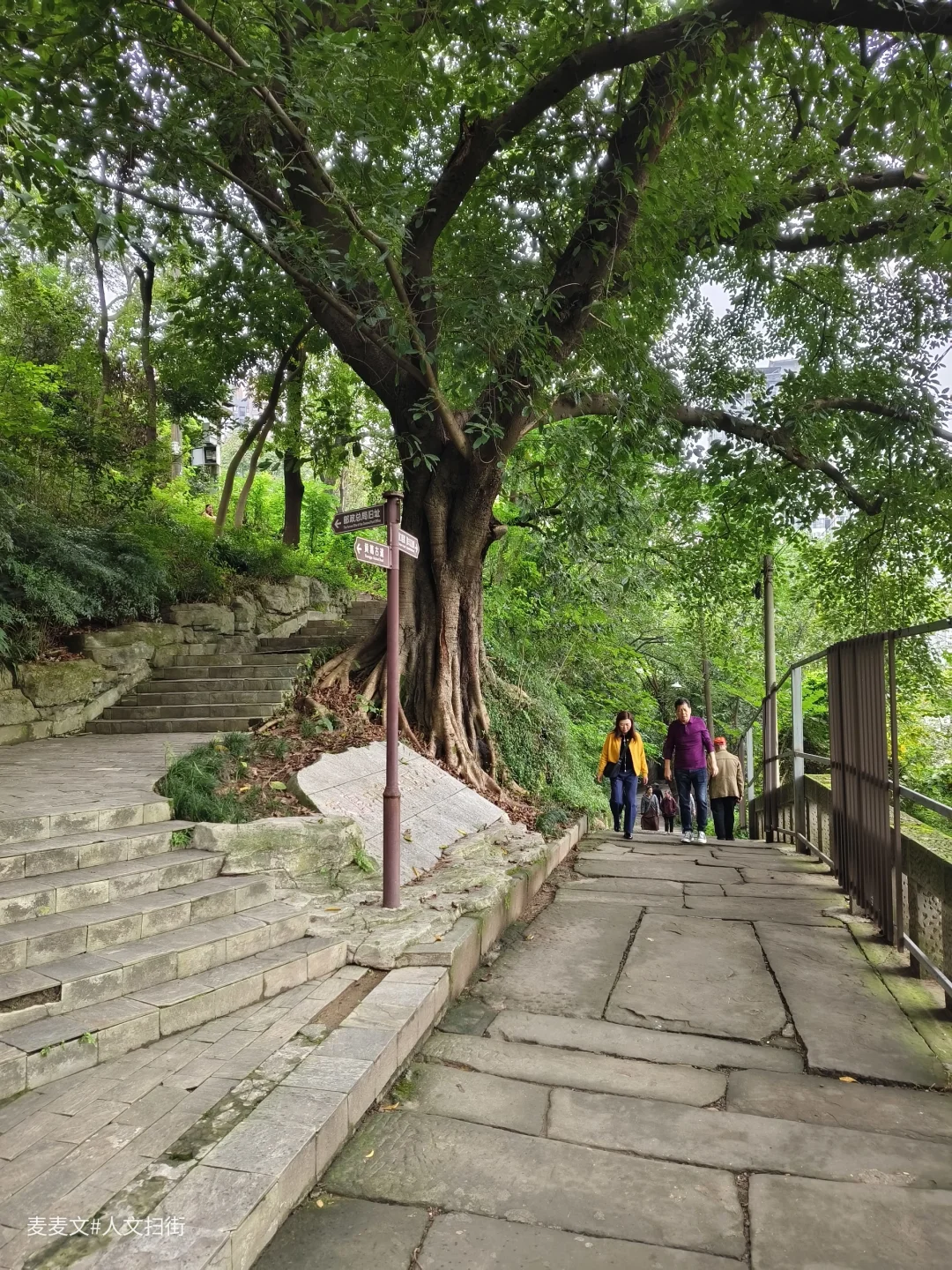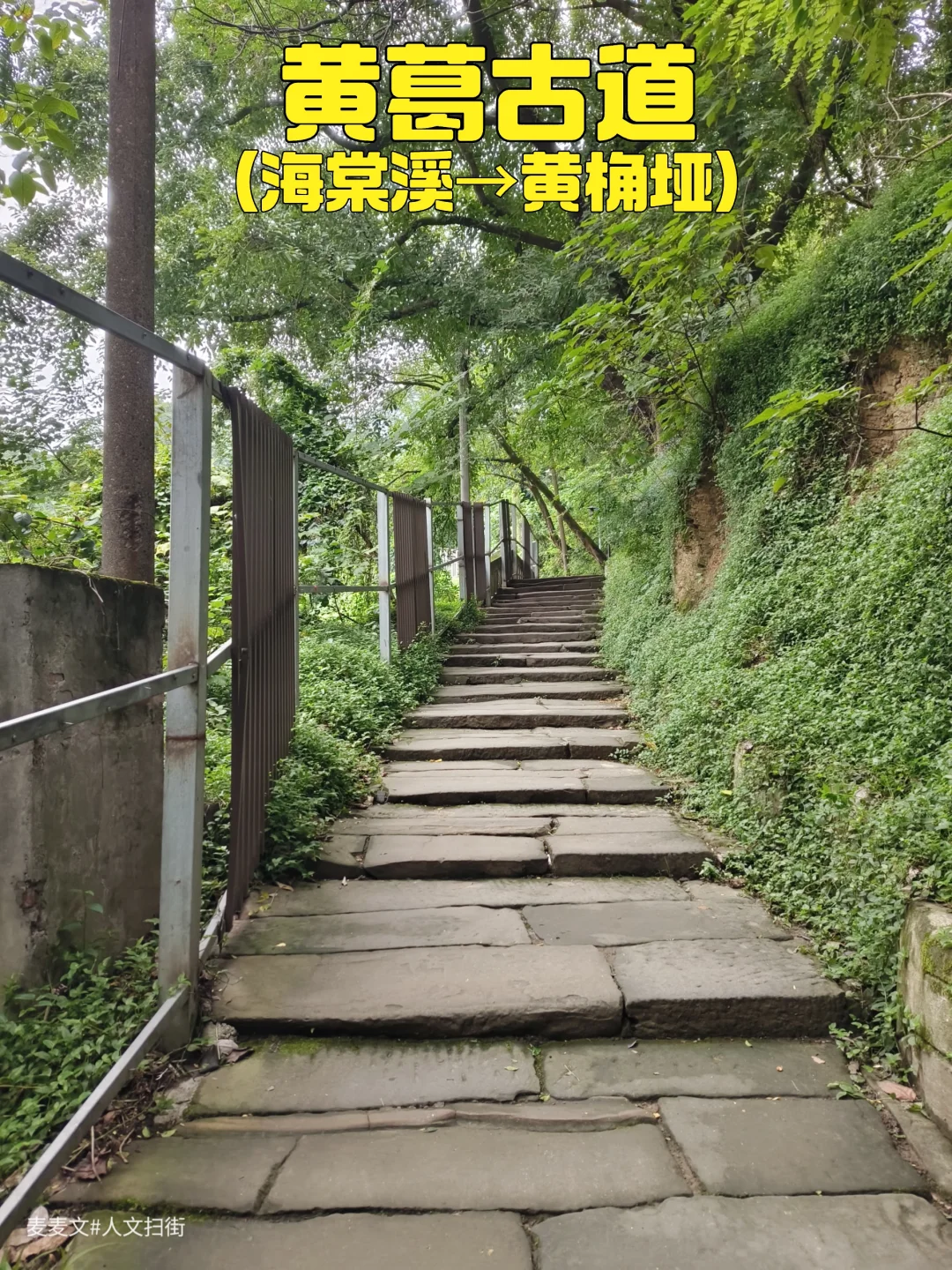 黄葛古道的另一条路起于重庆市南岸区海棠溪街道二院入口,紧邻老君洞的一条石磴盘曲的天梯云栈,两条路在黄桷垭口前汇合。据考证,该路始于唐宋,自此人群熙攘,热闹非凡。 黄桷古道的精彩段落,也是历代名人常经之地,曾留下丰富的题刻和诗词。抗战期间,入缅作战的部分军队也经此古道而过,足见其当年重要的交通作用。 在黄龙公路通车之前,也是重庆市区与黄桷垭的重要联系道路。漫步在青石板路上,青石板山径两侧一路数百年古老的黄桷树,虬枝粗干。树荫下青石径被往来人磨得水亮。