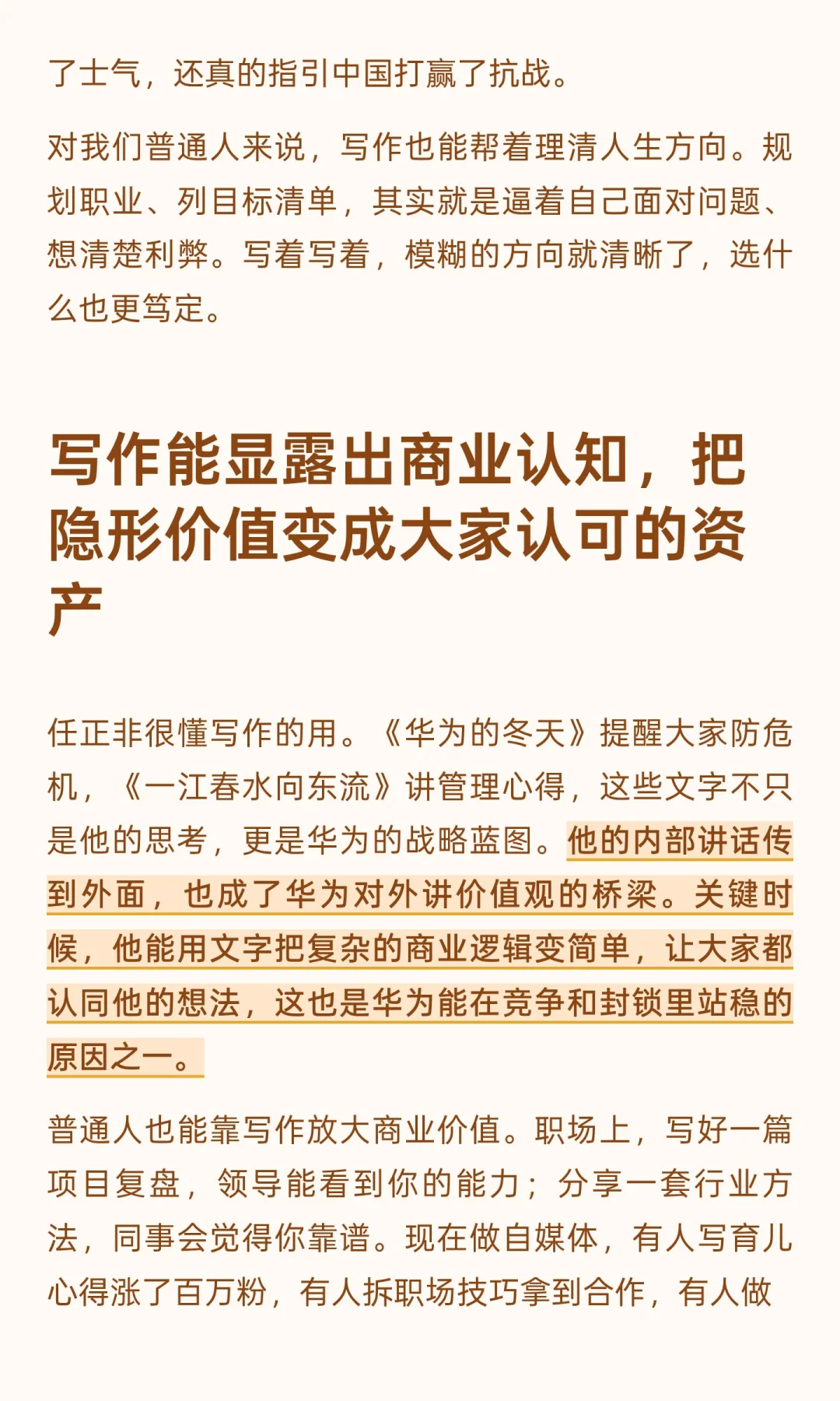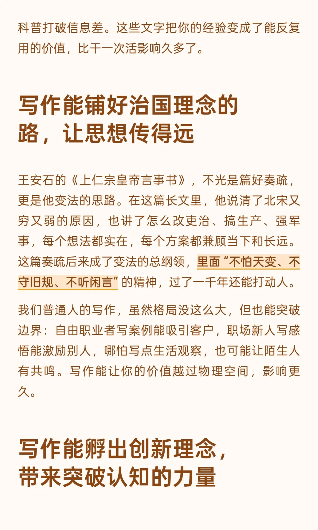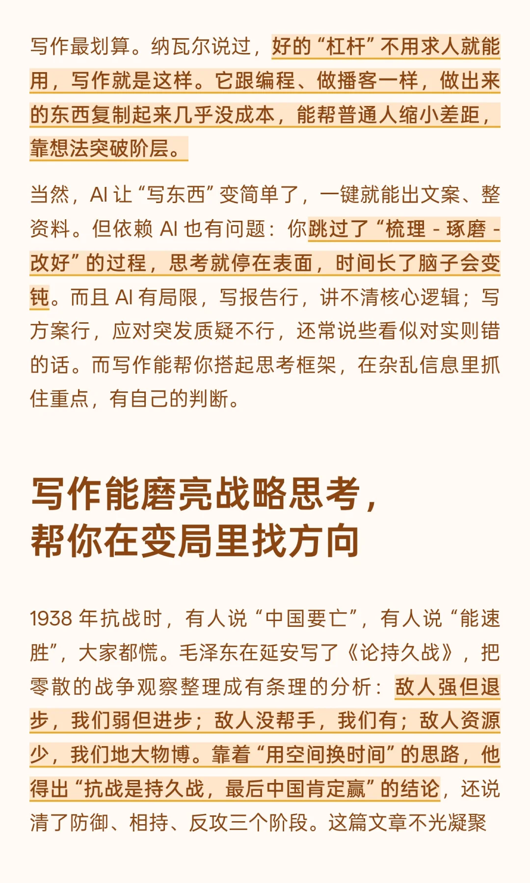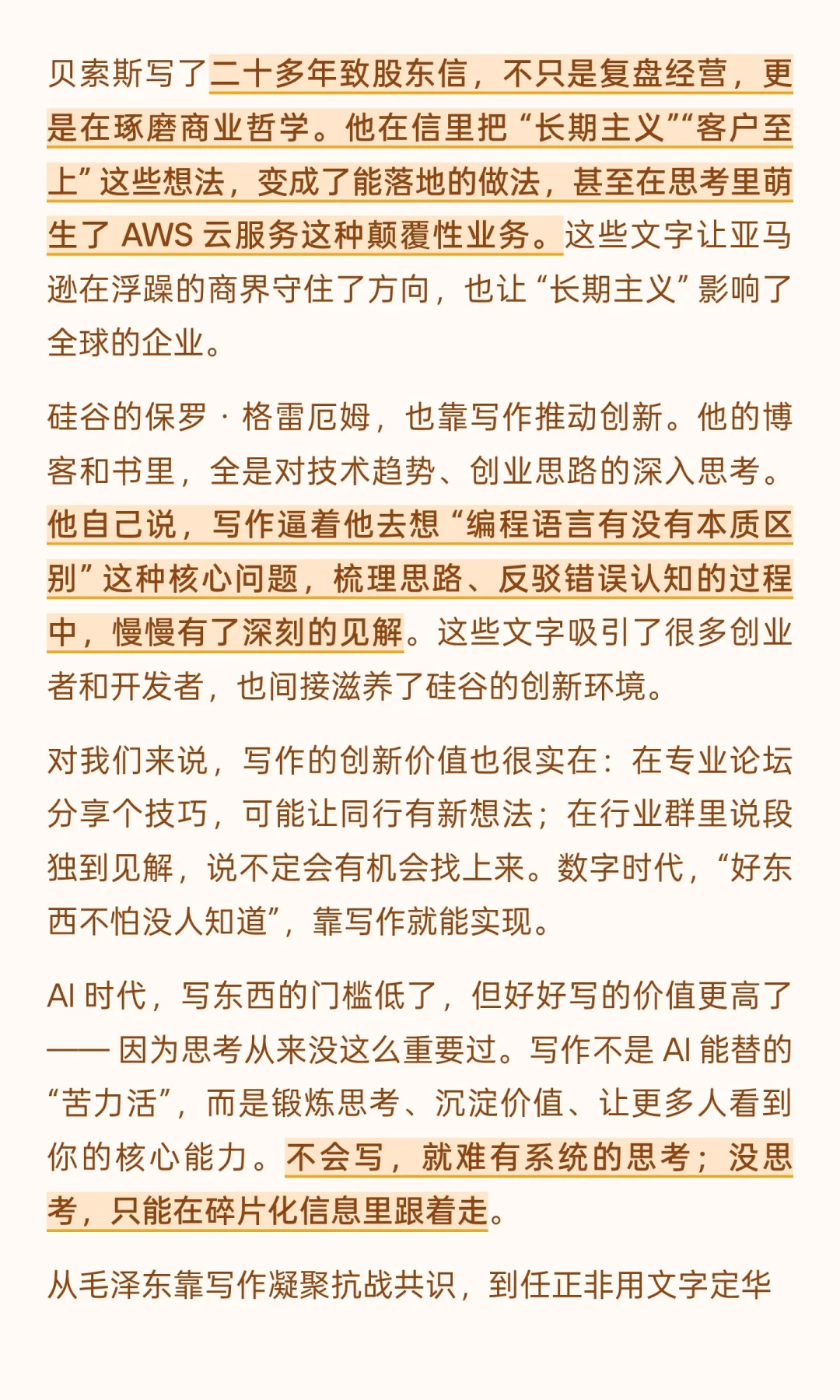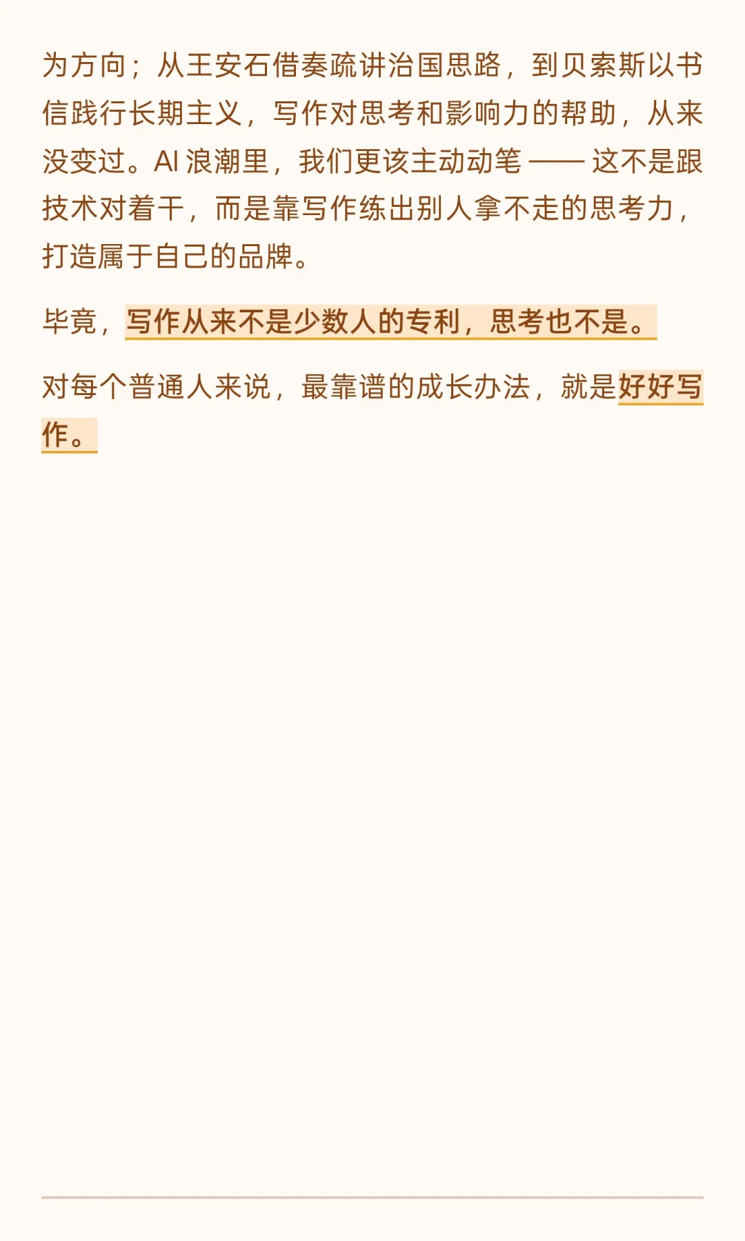 写作是思考的核心,帮助理清方向、提升商业认知、传递治国理念和孵化创新理念。 AI虽简化写作,但思考和沉淀价值仍需亲自写作。 写作是锻炼思考、沉淀价值、打造品牌的关键。 会写作,才真的会思考。