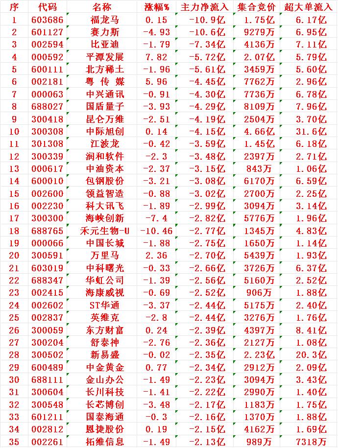 11月5日尾盘30分钟,主力资金大幅卖出的35名单! 福龙马:净流出 10.9亿元,集合竞价成交额 1.75亿元 赛力斯:净流出 10.6亿元,集合竞价成交额 9279万元 比亚迪:净流出 7.34亿元,集合竞价成交额 4136万元 平潭发展:净流出 5.72亿元,集合竞价成交额 2.07亿元 北方稀土:净流出 5.61亿元,集合竞价成交额 3459万元
