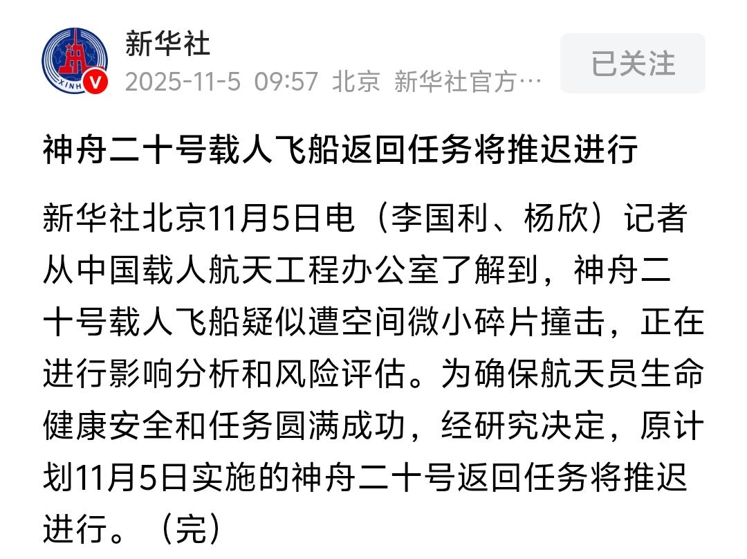 神二十飞船疑似遭太空垃圾碎片撞击,原定于今天的返回计划推迟。空间站的轨道安全应提上日程,总有刁民想害朕。不能给任何漏洞给那些人。东大的每组飞船都一定有备份的,无论任何突发情况,航天员的安全返回也是有保障的。 机械臂检查过后,静待官方评估消息。期待神20乘组安全回家[赞][赞]