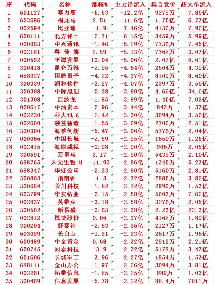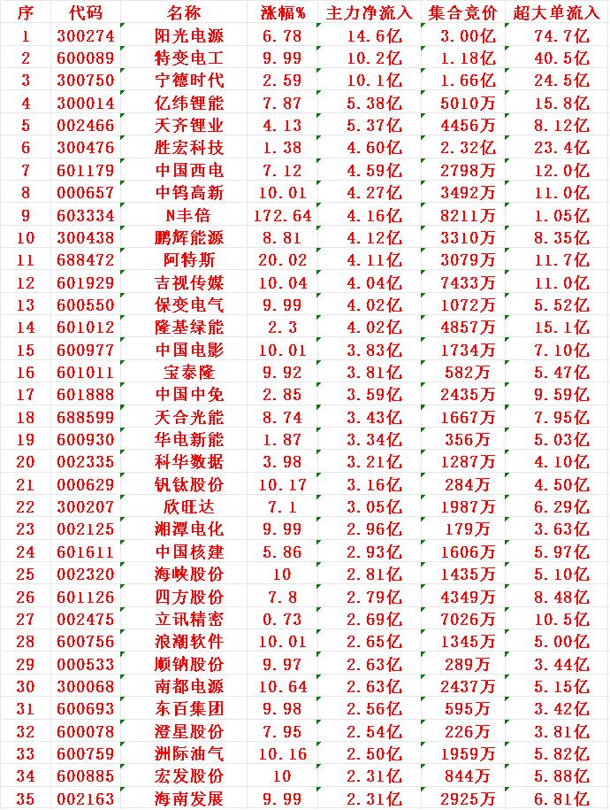11月5日收盘,主力趁冲高,已经大幅卖出的35名单: 力斯:净流出 12.2亿元,超大单流入 7.86亿元 福龙马:净流出 11.6亿元,超大单流入 6.73亿元 比亚迪:净流出 7.46亿元,超大单流入 7.96亿元 北方稀土:净流出 6.15亿元,超大单流入 5.99亿元 中兴通讯:净流出 5.29亿元,超大单流入 7.45亿元 粤 传 媒:净流出 5.13亿元,超大单流入 3.07亿元 11月5日收盘,主力资金“大幅买入”的35强: 阳光电源:净流入 14.6亿元 特变电工:净流入 10.2亿元 宁德时代:净流入 10.1亿元 亿纬锂能:净流入 5.38亿元 天齐锂业:净流入 5.37亿元 胜宏科技:净流入 4.60亿元 中国西电:净流入 4.59亿元 中钨高新:净流入 4.27亿元 N丰倍:净流入 4.16亿元 鹏辉能源:净流入 4.12亿元 阿特斯:净流入 4.11亿元 吉视传媒:净流入 4.04亿元 保变电气:净流入 4.02亿元 隆基绿能:净流入 4.02亿元 中国电影:净流入 3.83亿元