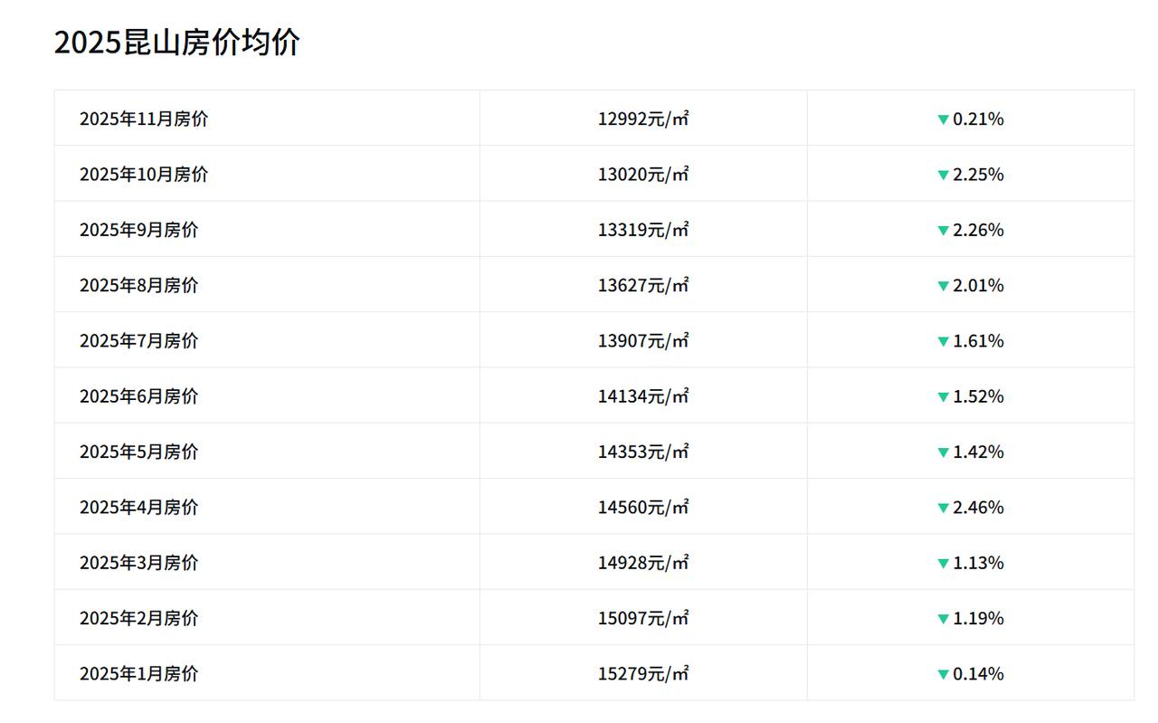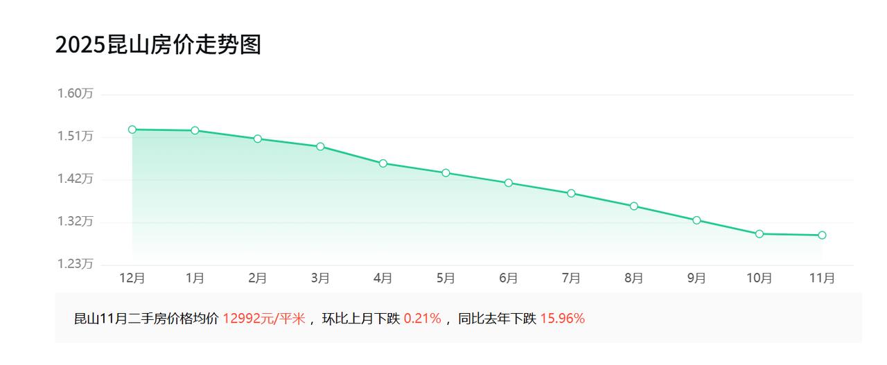 持续回调! 2015年10月,昆山房价均价7448元; 2016年10月,昆山房价均价10608元; 2017年10月,昆山房价均价11385元; 2018年10月,昆山房价均价13457元; 2019年10月,昆山房价均价15553元; 2020年10月,昆山房价均价16733元; 2021年10月,昆山房价均价18078元; 2022年10月,昆山房价均价18830元; 2023年10月,昆山房价均价18222元; 2024年10月,昆山房价均价15675元; 2025年10月,昆山房价均价13020元。   2015年至2025年,昆山的楼市简直像一部跌宕起伏的电视剧,有疯狂上涨的狂欢,也有持续回调的冷静。   2015年至2016年,单价从7448元涨到10608元,涨幅超40%,那时上海外溢需求旺盛,市场上今天不买明天就涨的情绪弥漫,不少楼盘开盘即售罄。   2017年至2018年,限购政策出台,但房价依然压不住,从11385元涨到13457元。开发商咬死价格不松口,购房者边骂边排队。   2019年至2022年,进入温水煮青蛙阶段,单价冲破1.8万。虽然涨幅放缓,但每年稳涨1000元左右,刚需客群开始叫苦不迭。   2023年出现拐点,房价从1.88万回落到1.82万,结束了连续8年的上涨。   2024年至2025年开始下跌,2025年10月均价已回落至1.3万元,基本回到2017年水平。   目前昆山二手房均价已连续11个月下行,部分急售房源单价跌破1.3万。但核心区玉山镇、学区房价格相对坚挺,远郊花桥、陆家镇跌幅显著,有的甚至比高点跌去近30%。   昆山作为产业基础扎实的百强县,人口吸附力仍在。玉山、巴城等核心区有望率先企稳,但想重现十年翻20倍的辉煌可能性不大。