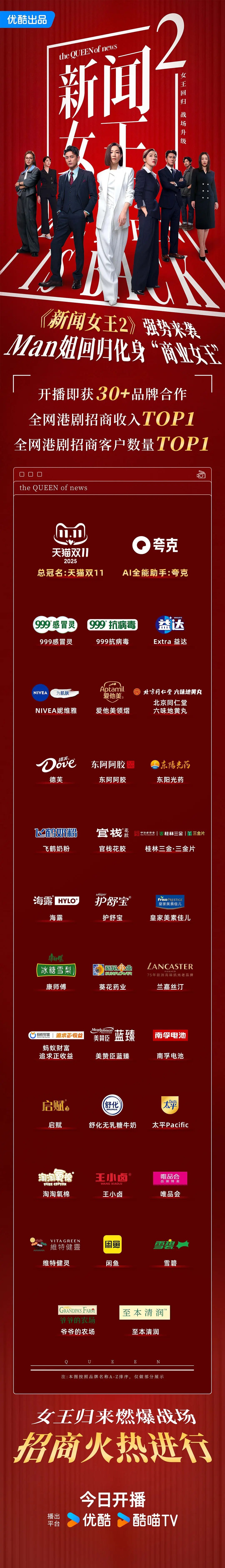 新闻女王2开局11广,总冠名天猫双11,港剧招商收入top1,港剧招商数量top1