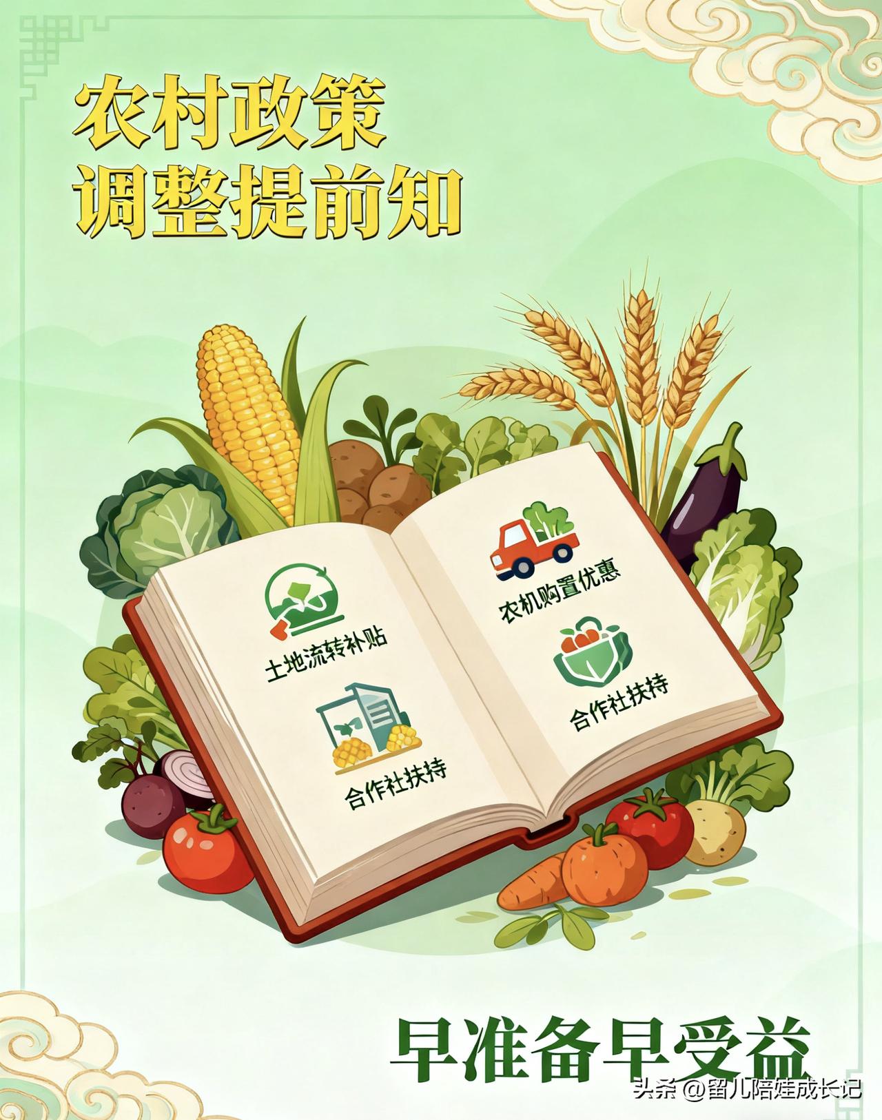 乡村政策快讯:农村政策调整提前知,早准备早受益 随着国家乡村振兴战略的持续推进,农村政策的调整和优化越来越频繁。对于广大农民朋友来说,及时了解并掌握这些政策变化,不仅能避免因信息滞后而错失机会,还能提前做好准备,在政策红利中抢占先机。 一、为什么要关注政策变化? 政策调整往往伴随着资源的重新分配和支持方向的变化。比如,今年中央一号文件中明确提出要加强粮食安全保障、推进农业绿色发展、完善农村基础设施建设等。这些政策不仅涉及资金支持、技术推广,还可能带来土地流转、产业扶持、信贷优惠等具体措施。如果能提前知晓,就能根据自身情况调整生产经营计划,最大化政策红利。 二、如何及时获取政策信息? 1. 官方渠道:关注农业农村部、财政部等政府部门的官网、公众号和官方发布的政策文件。这些渠道信息权威、更新及时。 2. 地方政府和基层组织:乡镇政府、村委会、合作社等是政策落地的“最后一公里”,他们会根据当地实际情况解读政策,提供具体指导。 3. 权威媒体和专业平台:如央视农业农村频道、地方电视台、知名农业类公众号等,这些平台会对政策进行深度解读,帮助农民理解政策的具体内容和操作方法。 4. 农技推广机构和专家团队:农业技术推广中心、科研院所、农业院校等机构会组织培训和宣讲活动,帮助农民掌握政策变化带来的新技术和新模式。 三、如何利用政策调整做好准备? 1. 提前规划:根据政策调整方向,调整种植、养殖结构,引入新的品种和技术,提升生产效率。 2. 争取支持:关注政策中的补贴、信贷优惠等内容,提前准备相关材料,及时申请,确保资金到位。 3. 合作共赢:政策往往鼓励规模化、产业化经营,通过合作社、家庭农场等组织形式,提升市场竞争力。 4. 防范风险:政策调整也可能带来市场波动,要做好风险评估和应对措施,比如购买农业保险、建立多元化销售渠道。 四、政策调整带来的机遇与挑战 政策调整带来的机遇是显而易见的:资金支持、技术引进、市场拓展等都能为农民带来实实在在的收益。但同时,也可能面临挑战,比如政策执行中的地区差异、配套措施不到位等。因此,农民朋友需要保持信息敏感,积极参与政策解读和培训,同时结合自身实际情况,灵活应对。 五、结语 农村政策的调整是为了更好地促进农业农村发展,提高农民收入。作为政策的直接受益者,农民朋友应主动关注、积极参与,做到“早知道、早准备、早受益”。只有这样,才能在政策红利中稳步前行,实现增收致富的目标。 农业振兴新规划 新农村规定 乡村新规