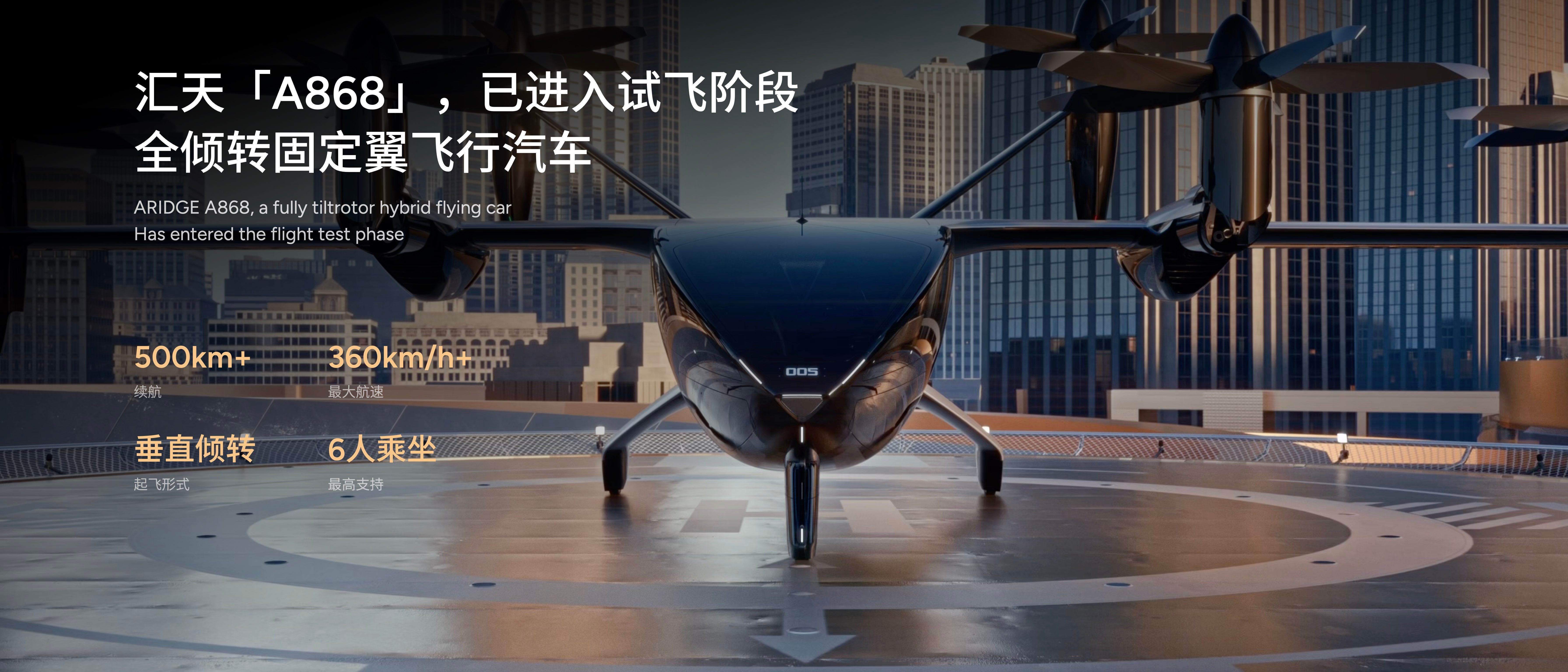 A868用全倾转构型,是混电内核,能跑500公里、最快360公里/小时,6座,正在飞行验证阶段。
