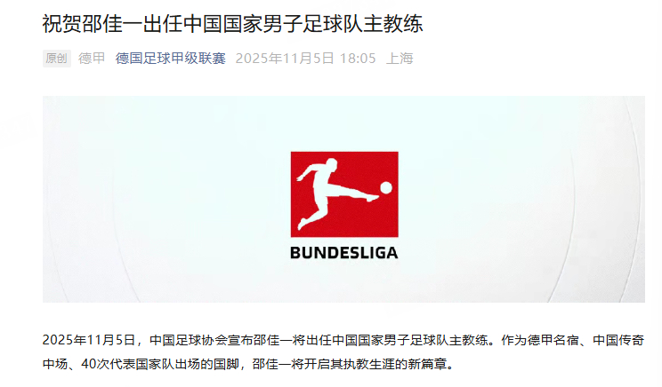 德甲官方祝贺邵佳一执教国足德甲官方祝贺邵佳一担任国足主帅
