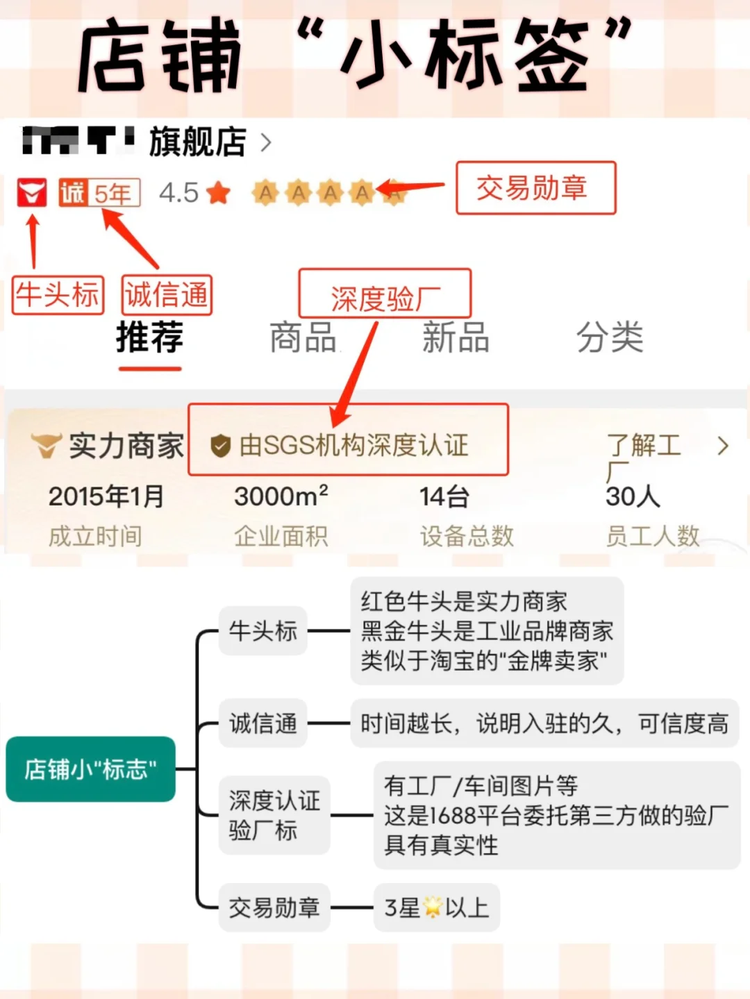 1)牛头标:认准牛头标!在店铺名字正下方,红色牛头是实力商家,黑金牛头是工业品牌商家,类似于淘宝的“金牌卖家”